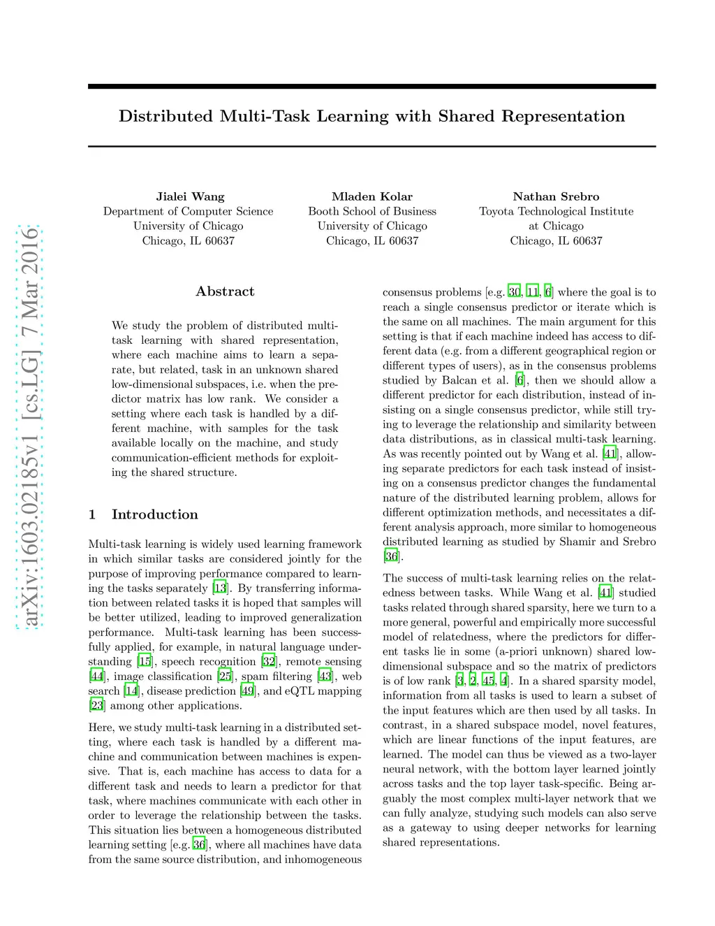 We study the problem of distributed multi-task learning with shared representation, where each machine aims to learn a separate, but related, task in an unknown shared low-dimensional subspaces, i.e. when the predictor matrix has low rank. We consider a setting where each task is handled by a different machine, with samples for the task available locally on the machine, and study communication-efficient methods for exploiting the shared structure.