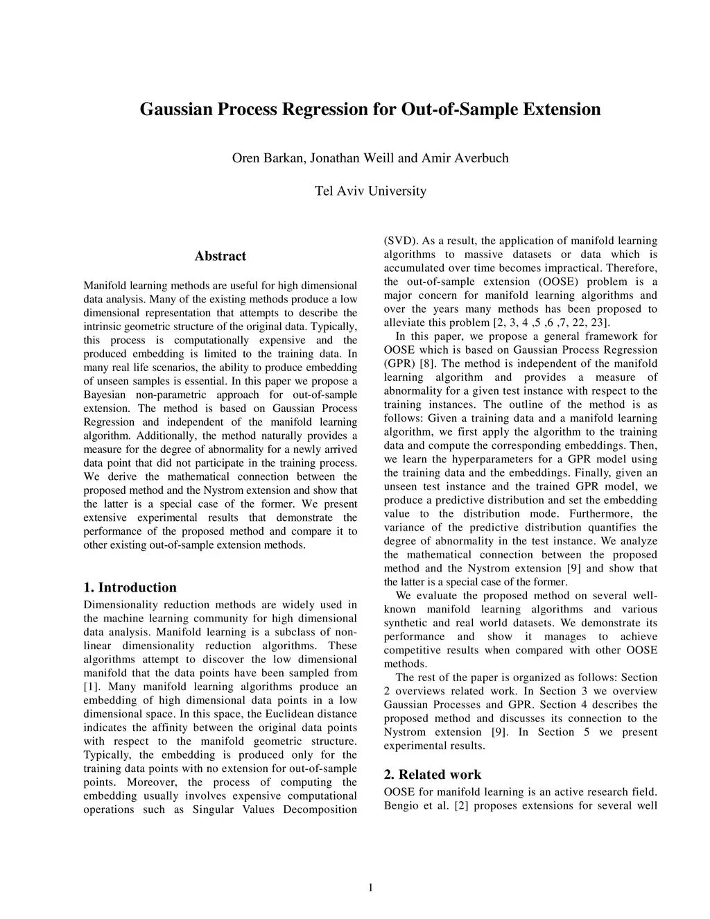 Manifold learning methods are useful for high dimensional data analysis. Many of the existing methods produce a low dimensional representation that attempts to describe the intrinsic geometric structure of the original data. Typically, this process is computationally expensive and the produced embedding is limited to the training data. In many real life scenarios, the ability to produce embedding of unseen samples is essential. In this paper we propose a Bayesian non-parametric approach for out-of-sample extension. The method is based on Gaussian Process Regression and independent of the manifold learning algorithm. Additionally, the method naturally provides a measure for the degree of abnormality for a newly arrived data point that did not participate in the training process. We derive the mathematical connection between the proposed method and the Nystrom extension and show that the latter is a special case of the former. We present extensive experimental results that demonstrate the performance of the proposed method and compare it to other existing out-of-sample extension methods.