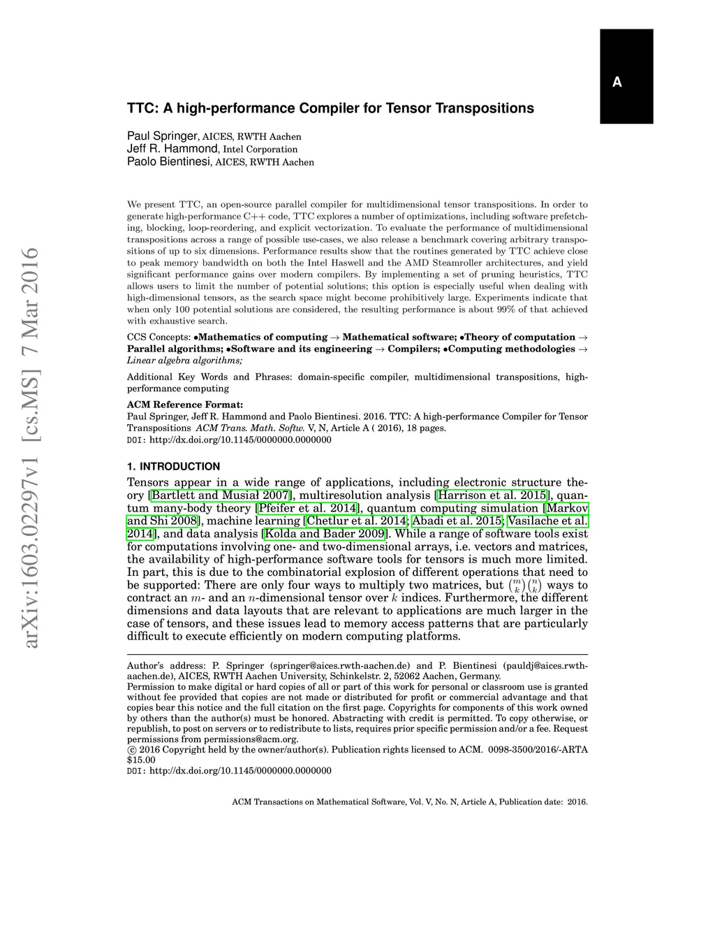 We present TTC, an open-source parallel compiler for multidimensional tensor transpositions. In order to generate high-performance C++ code, TTC explores a number of optimizations, including software prefetching, blocking, loop-reordering, and explicit vectorization. To evaluate the performance of multidimensional transpositions across a range of possible use-cases, we also release a benchmark covering arbitrary transpositions of up to six dimensions. Performance results show that the routines generated by TTC achieve close to peak memory bandwidth on both the Intel Haswell and the AMD Steamroller architectures, and yield significant performance gains over modern compilers. By implementing a set of pruning heuristics, TTC allows users to limit the number of potential solutions; this option is especially useful when dealing with high-dimensional tensors, as the search space might become prohibitively large. Experiments indicate that when only 100 potential solutions are considered, the resulting performance is about 99% of that achieved with exhaustive search.