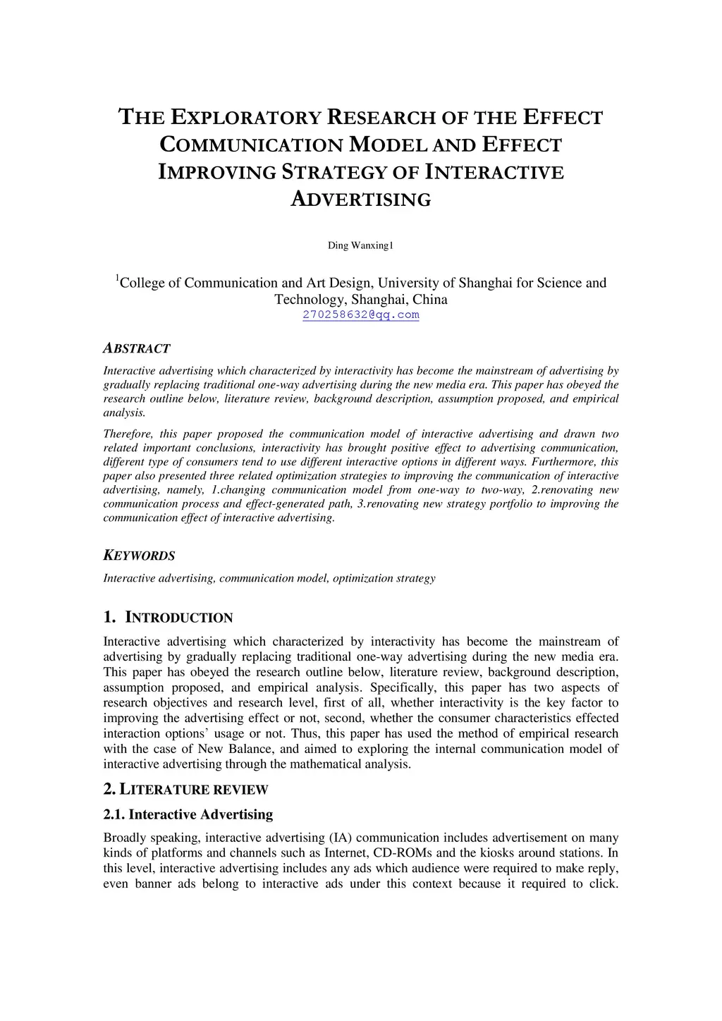 Interactive advertising which characterized by interactivity has become the mainstream of advertising by gradually replacing traditional one-way advertising during the new media era. This paper has obeyed the research outline below, literature review, background description, assumption proposed, and empirical analysis. Therefore, this paper proposed the communication model of interactive advertising and drawn two related important conclusions, interactivity has brought positive effect to advertising communication, different type of consumers tend to use different interactive options in different ways. Furthermore, this paper also presented three related optimization strategies to improving the communication of interactive advertising, namely, 1.changing communication model from one-way to two-way, 2.renovating new communication process and effect-generated path, 3.renovating new strategy portfolio to improving the communication effect of interactive advertising.