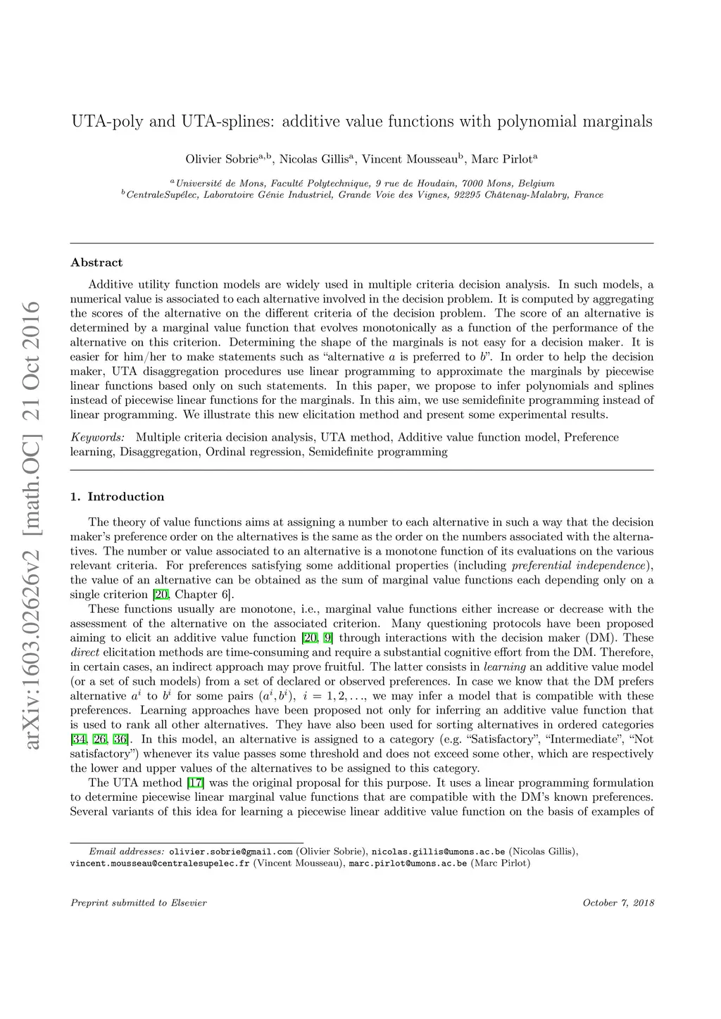 Additive utility function models are widely used in multiple criteria decision analysis. In such models, a numerical value is associated to each alternative involved in the decision problem. It is computed by aggregating the scores of the alternative on the different criteria of the decision problem. The score of an alternative is determined by a marginal value function that evolves monotonically as a function of the performance of the alternative on this criterion. Determining the shape of the marginals is not easy for a decision maker. It is easier for him/her to make statements such as "alternative is preferred to ". In order to help the decision maker, UTA disaggregation procedures use linear programming to approximate the marginals by piecewise linear functions based only on such statements. In this paper, we propose to infer polynomials and splines instead of piecewise linear functions for the marginals. In this aim, we use semidefinite programming instead of linear programming. We illustrate this new elicitation method and present some experimental results.