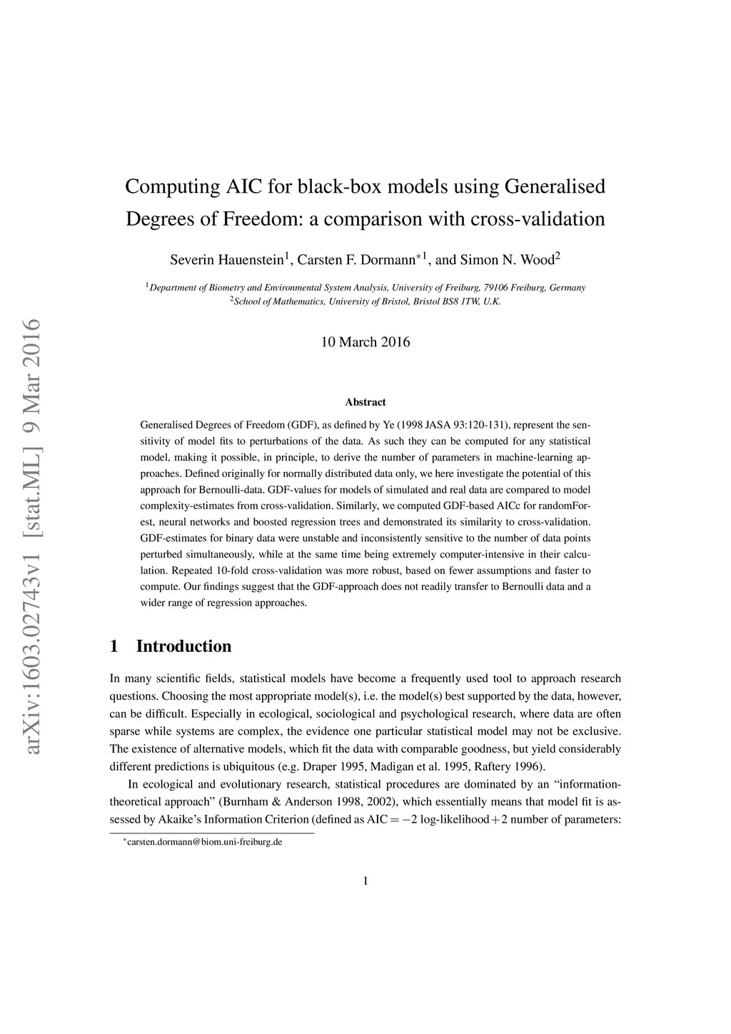 Generalised Degrees of Freedom (GDF), as defined by Ye (1998 JASA 93:120-131), represent the sensitivity of model fits to perturbations of the data. As such they can be computed for any statistical model, making it possible, in principle, to derive the number of parameters in machine-learning approaches. Defined originally for normally distributed data only, we here investigate the potential of this approach for Bernoulli-data. GDF-values for models of simulated and real data are compared to model complexity-estimates from cross-validation. Similarly, we computed GDF-based AICc for randomForest, neural networks and boosted regression trees and demonstrated its similarity to cross-validation. GDF-estimates for binary data were unstable and inconsistently sensitive to the number of data points perturbed simultaneously, while at the same time being extremely computer-intensive in their calculation. Repeated 10-fold cross-validation was more robust, based on fewer assumptions and faster to compute. Our findings suggest that the GDF-approach does not readily transfer to Bernoulli data and a wider range of regression approaches.