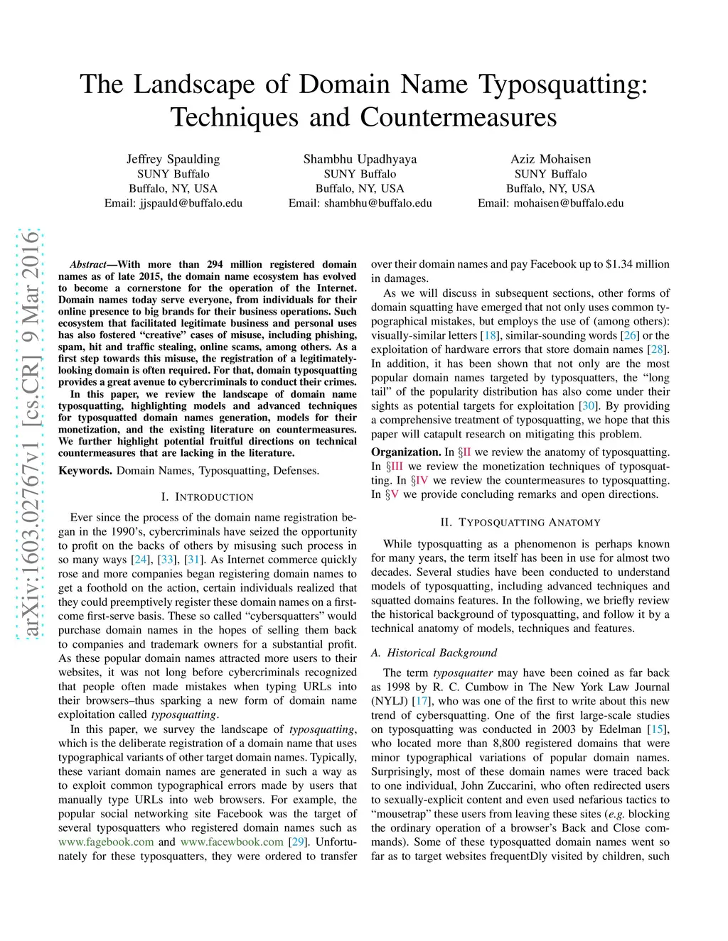 With more than 294 million registered domain names as of late 2015, the domain name ecosystem has evolved to become a cornerstone for the operation of the Internet. Domain names today serve everyone, from individuals for their online presence to big brands for their business operations. Such ecosystem that facilitated legitimate business and personal uses has also fostered "creative" cases of misuse, including phishing, spam, hit and traffic stealing, online scams, among others. As a first step towards this misuse, the registration of a legitimately-looking domain is often required. For that, domain typosquatting provides a great avenue to cybercriminals to conduct their crimes. In this paper, we review the landscape of domain name typosquatting, highlighting models and advanced techniques for typosquatted domain names generation, models for their monetization, and the existing literature on countermeasures. We further highlight potential fruitful directions on technical countermeasures that are lacking in the literature.