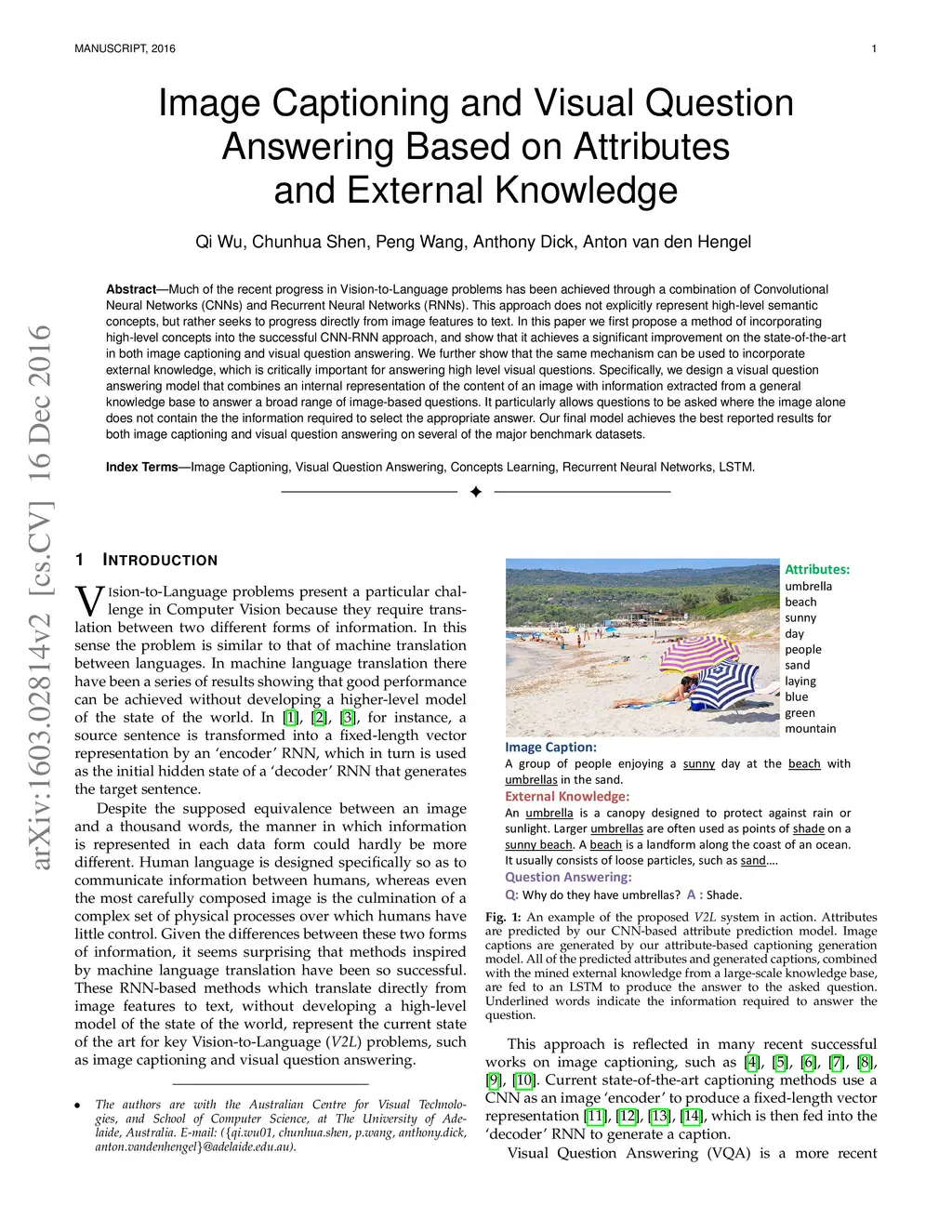 Much recent progress in Vision-to-Language problems has been achieved through a combination of Convolutional Neural Networks (CNNs) and Recurrent Neural Networks (RNNs). This approach does not explicitly represent high-level semantic concepts, but rather seeks to progress directly from image features to text. In this paper we first propose a method of incorporating high-level concepts into the successful CNN-RNN approach, and show that it achieves a significant improvement on the state-of-the-art in both image captioning and visual question answering. We further show that the same mechanism can be used to incorporate external knowledge, which is critically important for answering high level visual questions. Specifically, we design a visual question answering model that combines an internal representation of the content of an image with information extracted from a general knowledge base to answer a broad range of image-based questions. It particularly allows questions to be asked about the contents of an image, even when the image itself does not contain a complete answer. Our final model achieves the best reported results on both image captioning and visual question answering on several benchmark datasets.