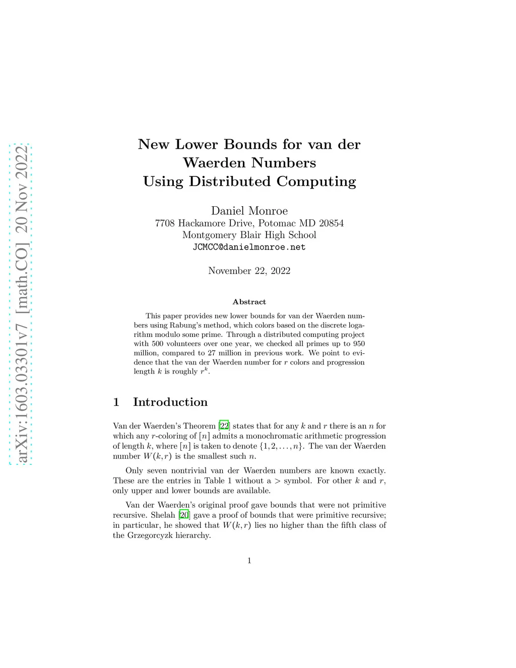 This paper provides new lower bounds for van der Waerden numbers using Rabung's method, which colors based on the discrete logarithm modulo some prime. Through a distributed computing project with 500 volunteers over one year, we checked all primes up to 950 million, compared to 27 million in previous work. We point to evidence that the van der Waerden number for colors and progression length is roughly .