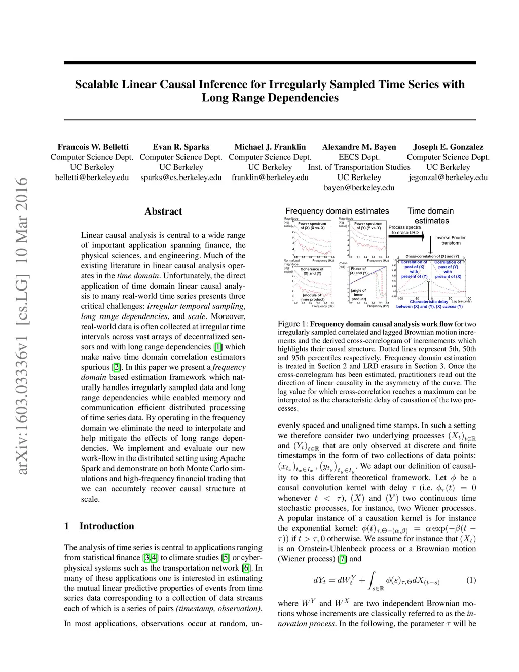 Linear causal analysis is central to a wide range of important application spanning finance, the physical sciences, and engineering. Much of the existing literature in linear causal analysis operates in the time domain. Unfortunately, the direct application of time domain linear causal analysis to many real-world time series presents three critical challenges: irregular temporal sampling, long range dependencies, and scale. Moreover, real-world data is often collected at irregular time intervals across vast arrays of decentralized sensors and with long range dependencies which make naive time domain correlation estimators spurious. In this paper we present a frequency domain based estimation framework which naturally handles irregularly sampled data and long range dependencies while enabled memory and communication efficient distributed processing of time series data. By operating in the frequency domain we eliminate the need to interpolate and help mitigate the effects of long range dependencies. We implement and evaluate our new work-flow in the distributed setting using Apache Spark and demonstrate on both Monte Carlo simulations and high-frequency financial trading that we can accurately recover causal structure at scale.