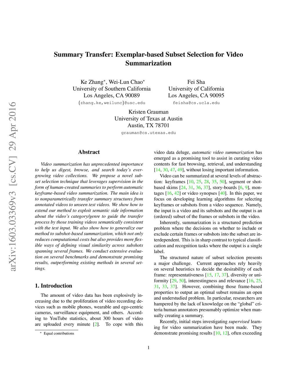 Summary Transfer: Exemplar-based Subset Selection for Video