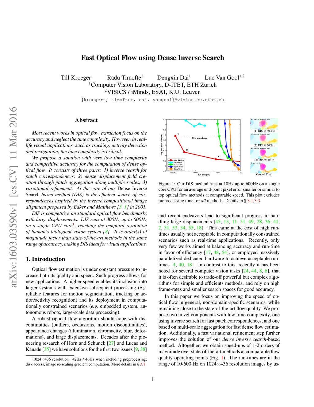 Most recent works in optical flow extraction focus on the accuracy and neglect the time complexity. However, in real-life visual applications, such as tracking, activity detection and recognition, the time complexity is critical. We propose a solution with very low time complexity and competitive accuracy for the computation of dense optical flow. It consists of three parts: 1) inverse search for patch correspondences; 2) dense displacement field creation through patch aggregation along multiple scales; 3) variational refinement. At the core of our Dense Inverse Search-based method (DIS) is the efficient search of correspondences inspired by the inverse compositional image alignment proposed by Baker and Matthews in 2001. DIS is competitive on standard optical flow benchmarks with large displacements. DIS runs at 300Hz up to 600Hz on a single CPU core, reaching the temporal resolution of human's biological vision system. It is order(s) of magnitude faster than state-of-the-art methods in the same range of accuracy, making DIS ideal for visual applications.