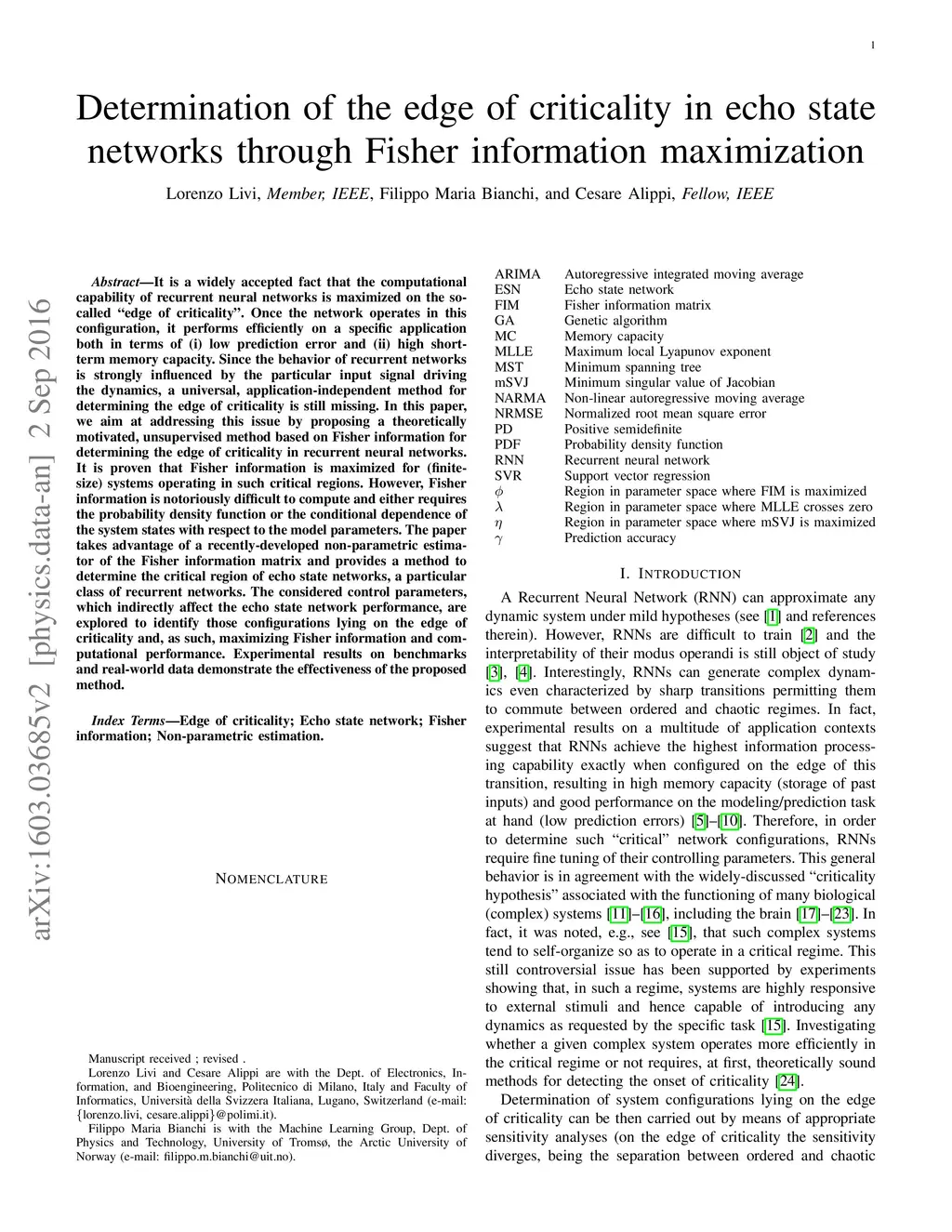 It is a widely accepted fact that the computational capability of recurrent neural networks is maximized on the so-called "edge of criticality". Once the network operates in this configuration, it performs efficiently on a specific application both in terms of (i) low prediction error and (ii) high short-term memory capacity. Since the behavior of recurrent networks is strongly influenced by the particular input signal driving the dynamics, a universal, application-independent method for determining the edge of criticality is still missing. In this paper, we aim at addressing this issue by proposing a theoretically motivated, unsupervised method based on Fisher information for determining the edge of criticality in recurrent neural networks. It is proven that Fisher information is maximized for (finite-size) systems operating in such critical regions. However, Fisher information is notoriously difficult to compute and either requires the probability density function or the conditional dependence of the system states with respect to the model parameters. The paper takes advantage of a recently-developed non-parametric estimator of the Fisher information matrix and provides a method to determine the critical region of echo state networks, a particular class of recurrent networks. The considered control parameters, which indirectly affect the echo state network performance, are explored to identify those configurations lying on the edge of criticality and, as such, maximizing Fisher information and computational performance. Experimental results on benchmarks and real-world data demonstrate the effectiveness of the proposed method.