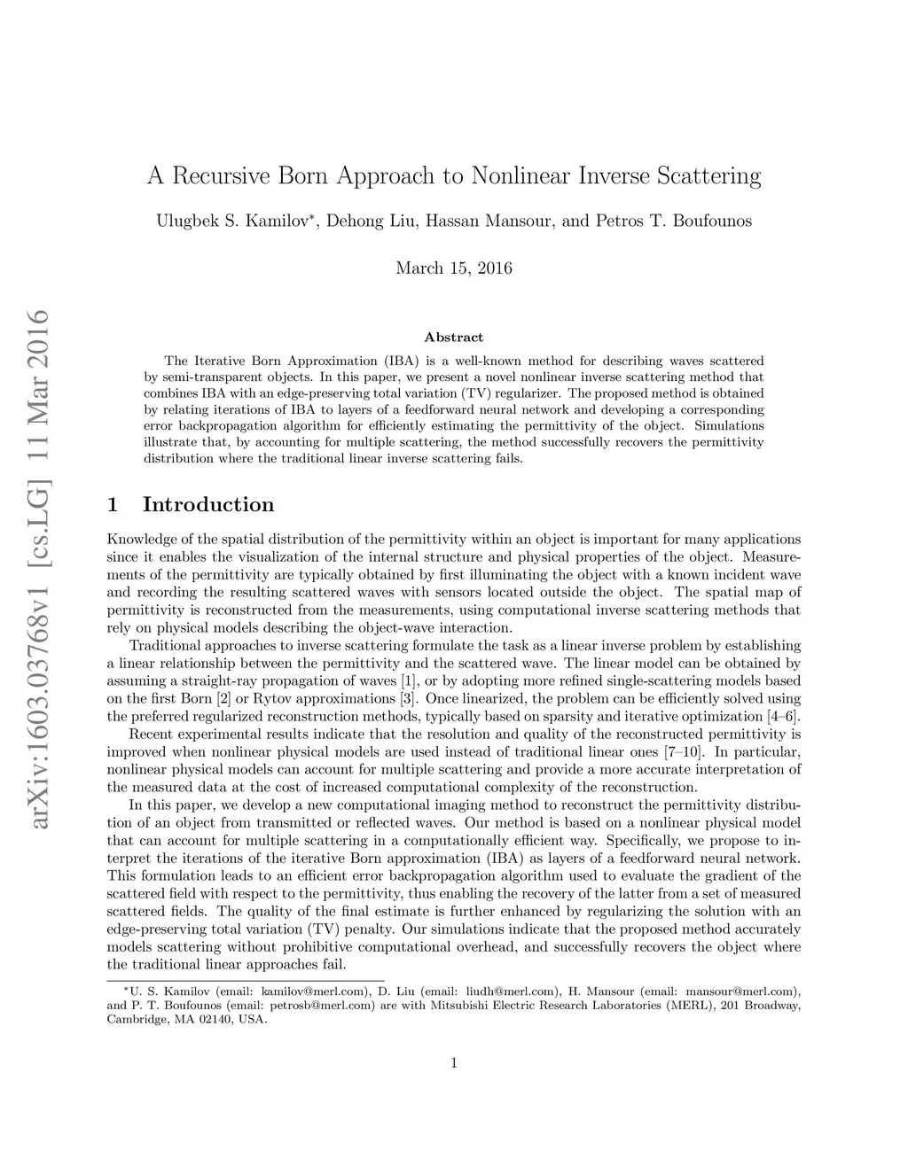 The Iterative Born Approximation (IBA) is a well-known method for describing waves scattered by semi-transparent objects. In this paper, we present a novel nonlinear inverse scattering method that combines IBA with an edge-preserving total variation (TV) regularizer. The proposed method is obtained by relating iterations of IBA to layers of a feedforward neural network and developing a corresponding error backpropagation algorithm for efficiently estimating the permittivity of the object. Simulations illustrate that, by accounting for multiple scattering, the method successfully recovers the permittivity distribution where the traditional linear inverse scattering fails.