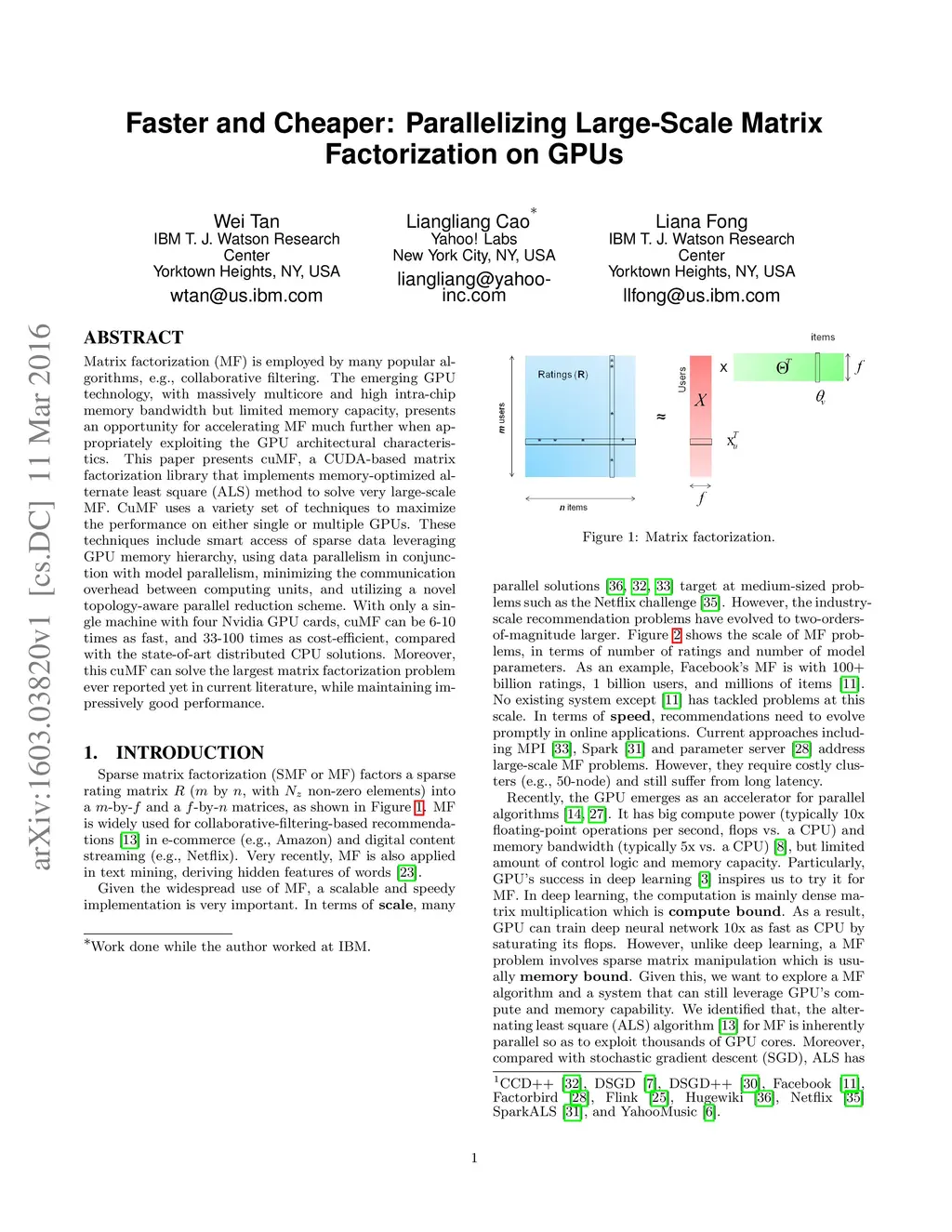 Matrix factorization (MF) is employed by many popular algorithms, e.g., collaborative filtering. The emerging GPU technology, with massively multicore and high intra-chip memory bandwidth but limited memory capacity, presents an opportunity for accelerating MF much further when appropriately exploiting the GPU architectural characteristics. This paper presents cuMF, a CUDA-based matrix factorization library that implements memory-optimized alternate least square (ALS) method to solve very large-scale MF. CuMF uses a variety set of techniques to maximize the performance on either single or multiple GPUs. These techniques include smart access of sparse data leveraging GPU memory hierarchy, using data parallelism in conjunction with model parallelism, minimizing the communication overhead between computing units, and utilizing a novel topology-aware parallel reduction scheme. With only a single machine with four Nvidia GPU cards, cuMF can be 6-10 times as fast, and 33-100 times as cost-efficient, compared with the state-of-art distributed CPU solutions. Moreover, this cuMF can solve the largest matrix factorization problem ever reported yet in current literature, while maintaining impressively good performance.
