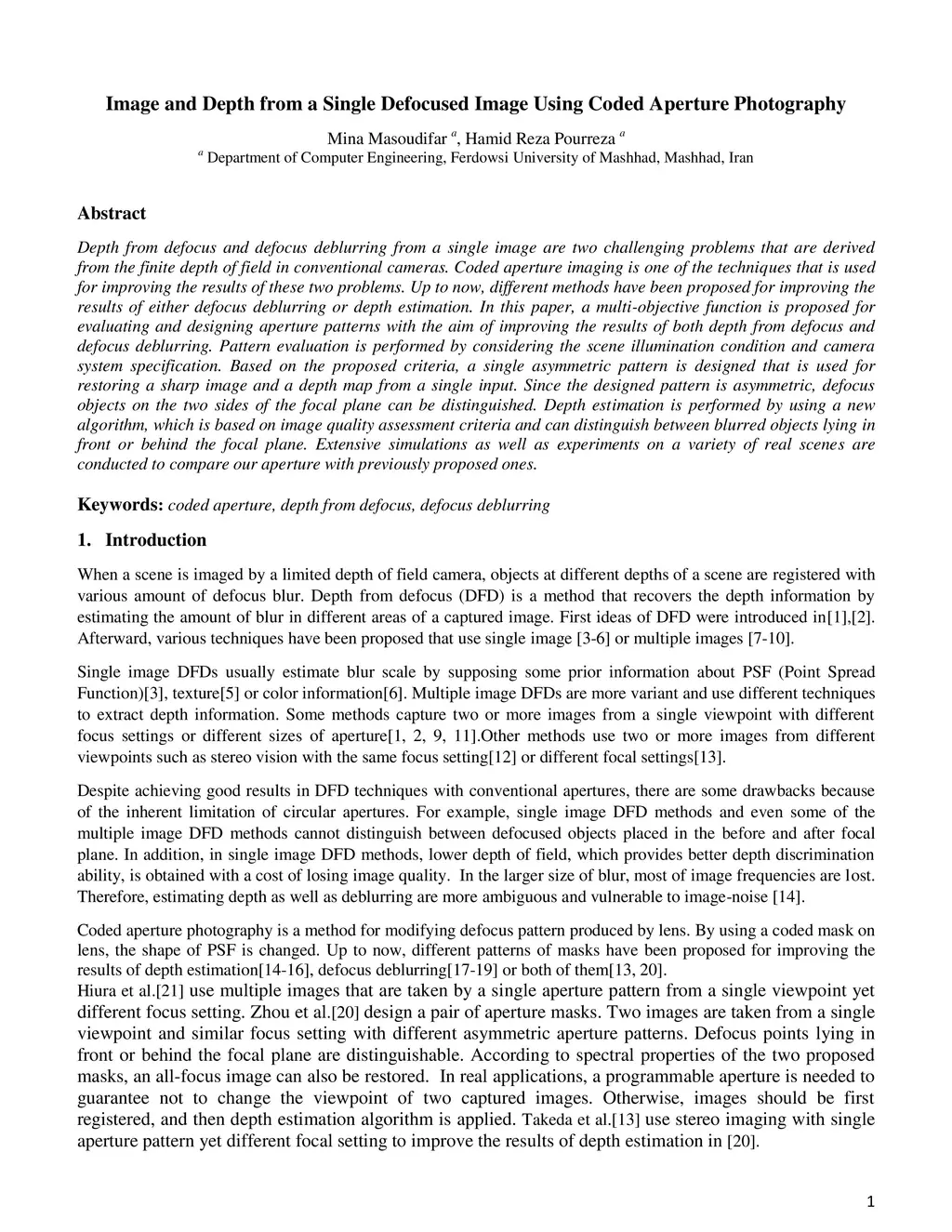 Image and Depth from a Single Defocused Image Using Coded Aperture