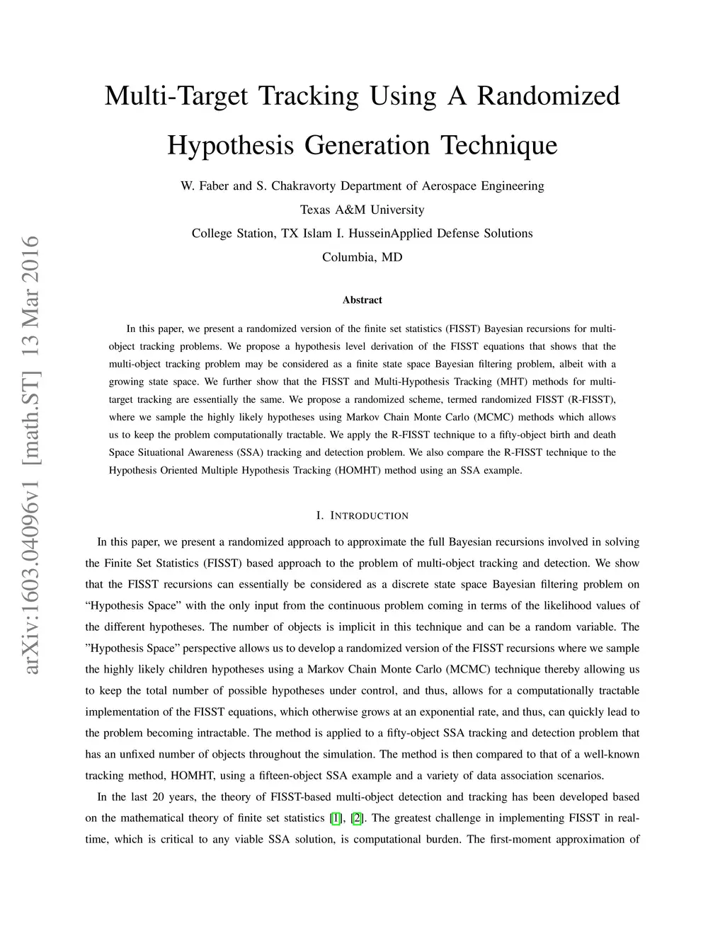 In this paper, we present a randomized version of the finite set statistics (FISST) Bayesian recursions for multi-object tracking problems. We propose a hypothesis level derivation of the FISST equations that shows that the multi-object tracking problem may be considered as a finite state space Bayesian filtering problem, albeit with a growing state space. We further show that the FISST and Multi-Hypothesis Tracking (MHT) methods for multi-target tracking are essentially the same. We propose a randomized scheme, termed randomized FISST (R-FISST), where we sample the highly likely hypotheses using Markov Chain Monte Carlo (MCMC) methods which allows us to keep the problem computationally tractable. We apply the R-FISST technique to a fifty-object birth and death Space Situational Awareness (SSA) tracking and detection problem. We also compare the R-FISST technique to the Hypothesis Oriented Multiple Hypothesis Tracking (HOMHT) method using an SSA example.