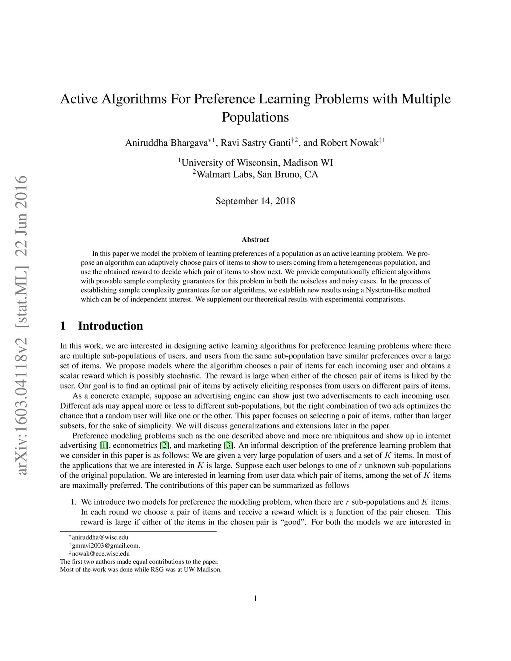 In this paper we model the problem of learning preferences of a population as an active learning problem. We propose an algorithm can adaptively choose pairs of items to show to users coming from a heterogeneous population, and use the obtained reward to decide which pair of items to show next. We provide computationally efficient algorithms with provable sample complexity guarantees for this problem in both the noiseless and noisy cases. In the process of establishing sample complexity guarantees for our algorithms, we establish new results using a Nystr{\"o}m-like method which can be of independent interest. We supplement our theoretical results with experimental comparisons.
