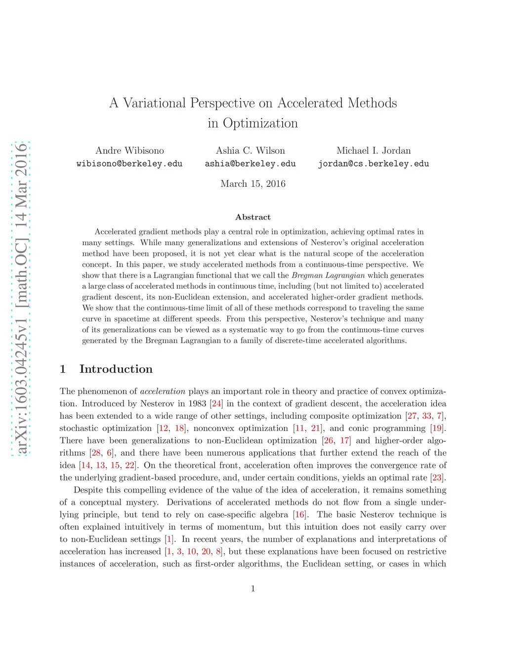 Accelerated gradient methods play a central role in optimization, achieving optimal rates in many settings. While many generalizations and extensions of Nesterov's original acceleration method have been proposed, it is not yet clear what is the natural scope of the acceleration concept. In this paper, we study accelerated methods from a continuous-time perspective. We show that there is a Lagrangian functional that we call the \emph{Bregman Lagrangian} which generates a large class of accelerated methods in continuous time, including (but not limited to) accelerated gradient descent, its non-Euclidean extension, and accelerated higher-order gradient methods. We show that the continuous-time limit of all of these methods correspond to traveling the same curve in spacetime at different speeds. From this perspective, Nesterov's technique and many of its generalizations can be viewed as a systematic way to go from the continuous-time curves generated by the Bregman Lagrangian to a family of discrete-time accelerated algorithms.