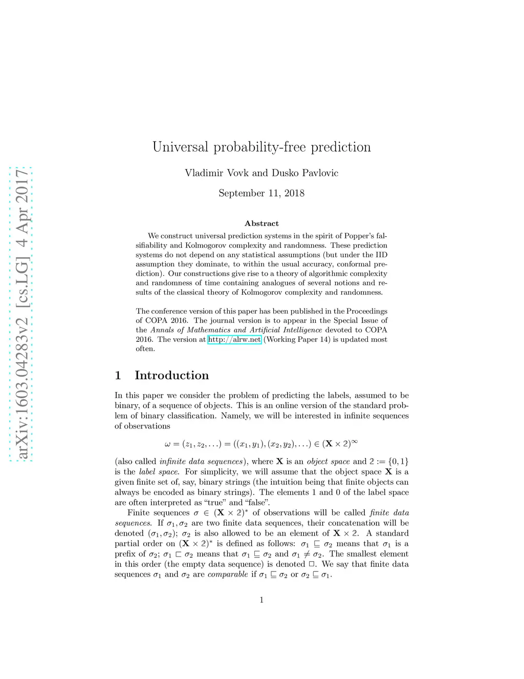 We construct universal prediction systems in the spirit of Popper's falsifiability and Kolmogorov complexity and randomness. These prediction systems do not depend on any statistical assumptions (but under the IID assumption they dominate, to within the usual accuracy, conformal prediction). Our constructions give rise to a theory of algorithmic complexity and randomness of time containing analogues of several notions and results of the classical theory of Kolmogorov complexity and randomness.