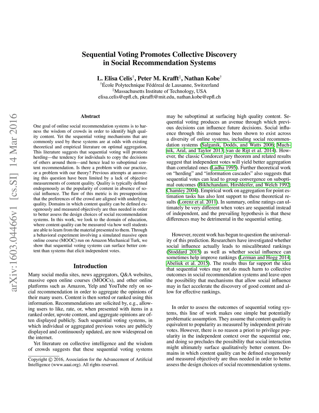 One goal of online social recommendation systems is to harness the wisdom of crowds in order to identify high quality content. Yet the sequential voting mechanisms that are commonly used by these systems are at odds with existing theoretical and empirical literature on optimal aggregation. This literature suggests that sequential voting will promote herding---the tendency for individuals to copy the decisions of others around them---and hence lead to suboptimal content recommendation. Is there a problem with our practice, or a problem with our theory? Previous attempts at answering this question have been limited by a lack of objective measurements of content quality. Quality is typically defined endogenously as the popularity of content in absence of social influence. The flaw of this metric is its presupposition that the preferences of the crowd are aligned with underlying quality. Domains in which content quality can be defined exogenously and measured objectively are thus needed in order to better assess the design choices of social recommendation systems. In this work, we look to the domain of education, where content quality can be measured via how well students are able to learn from the material presented to them. Through a behavioral experiment involving a simulated massive open online course (MOOC) run on Amazon Mechanical Turk, we show that sequential voting systems can surface better content than systems that elicit independent votes.