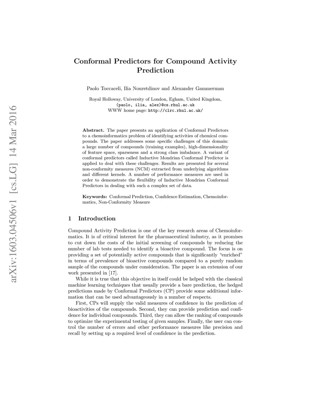 The paper presents an application of Conformal Predictors to a chemoinformatics problem of identifying activities of chemical compounds. The paper addresses some specific challenges of this domain: a large number of compounds (training examples), high-dimensionality of feature space, sparseness and a strong class imbalance. A variant of conformal predictors called Inductive Mondrian Conformal Predictor is applied to deal with these challenges. Results are presented for several non-conformity measures (NCM) extracted from underlying algorithms and different kernels. A number of performance measures are used in order to demonstrate the flexibility of Inductive Mondrian Conformal Predictors in dealing with such a complex set of data. Keywords: Conformal Prediction, Confidence Estimation, Chemoinformatics, Non-Conformity Measure.