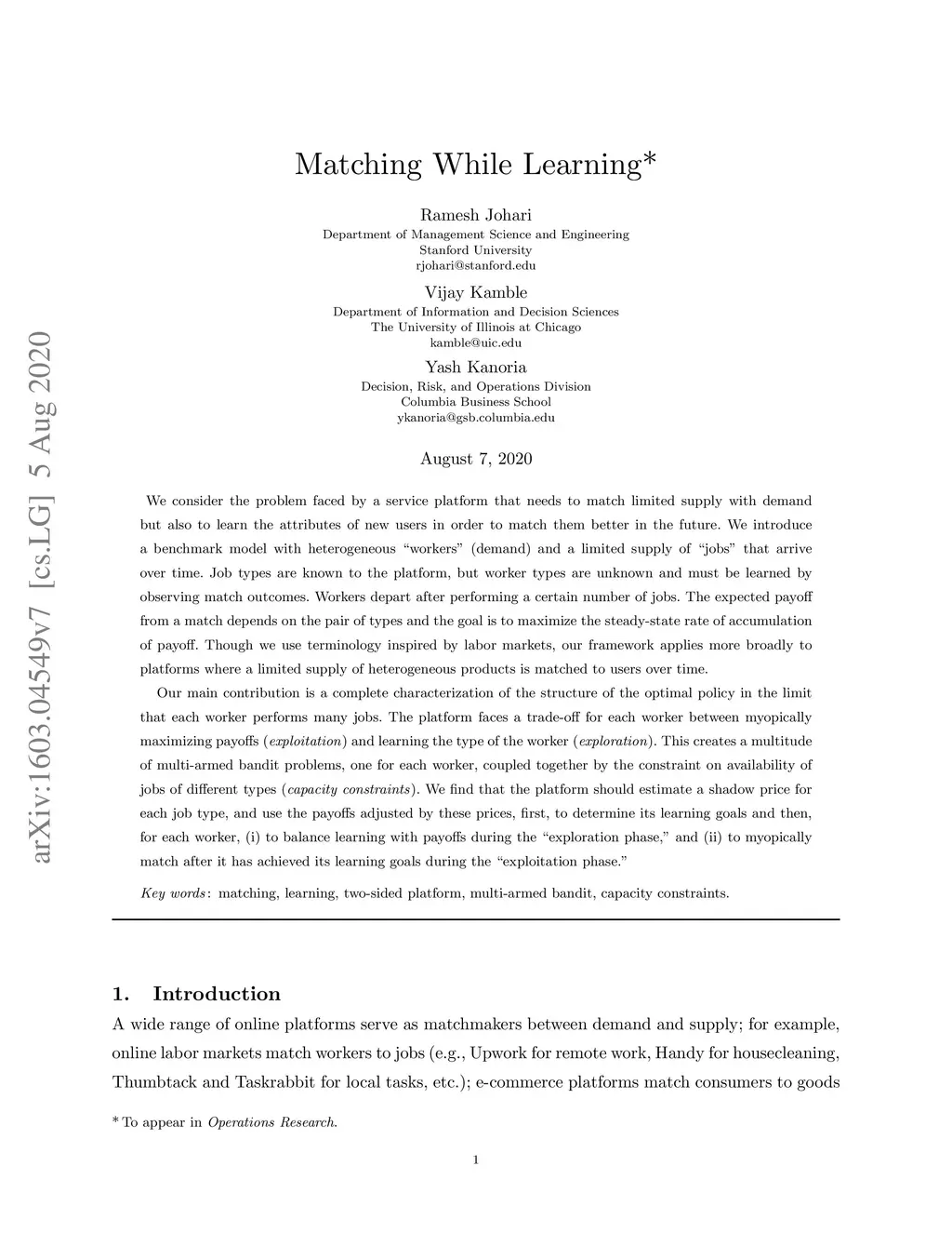 We consider the problem faced by a service platform that needs to match limited supply with demand but also to learn the attributes of new users in order to match them better in the future. We introduce a benchmark model with heterogeneous "workers" (demand) and a limited supply of "jobs" that arrive over time. Job types are known to the platform, but worker types are unknown and must be learned by observing match outcomes. Workers depart after performing a certain number of jobs. The expected payoff from a match depends on the pair of types and the goal is to maximize the steady-state rate of accumulation of payoff. Though we use terminology inspired by labor markets, our framework applies more broadly to platforms where a limited supply of heterogeneous products is matched to users over time. Our main contribution is a complete characterization of the structure of the optimal policy in the limit that each worker performs many jobs. The platform faces a trade-off for each worker between myopically maximizing payoffs (exploitation) and learning the type of the worker (exploration). This creates a multitude of multi-armed bandit problems, one for each worker, coupled together by the constraint on availability of jobs of different types (capacity constraints). We find that the platform should estimate a shadow price for each job type, and use the payoffs adjusted by these prices, first, to determine its learning goals and then, for each worker, (i) to balance learning with payoffs during the "exploration phase," and (ii) to myopically match after it has achieved its learning goals during the "exploitation phase."