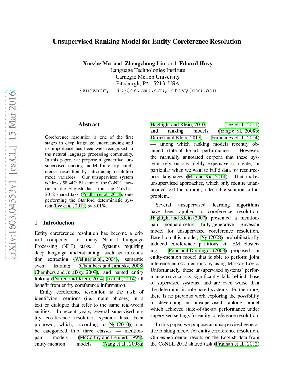 Unsupervised Ranking Model for Entity Coreference Resolution