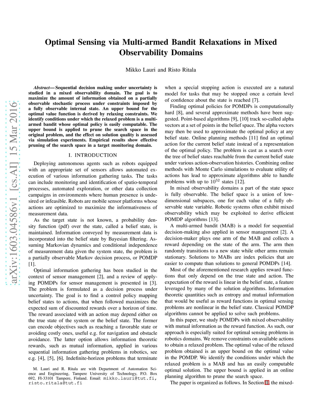 Sequential decision making under uncertainty is studied in a mixed observability domain. The goal is to maximize the amount of information obtained on a partially observable stochastic process under constraints imposed by a fully observable internal state. An upper bound for the optimal value function is derived by relaxing constraints. We identify conditions under which the relaxed problem is a multi-armed bandit whose optimal policy is easily computable. The upper bound is applied to prune the search space in the original problem, and the effect on solution quality is assessed via simulation experiments. Empirical results show effective pruning of the search space in a target monitoring domain.