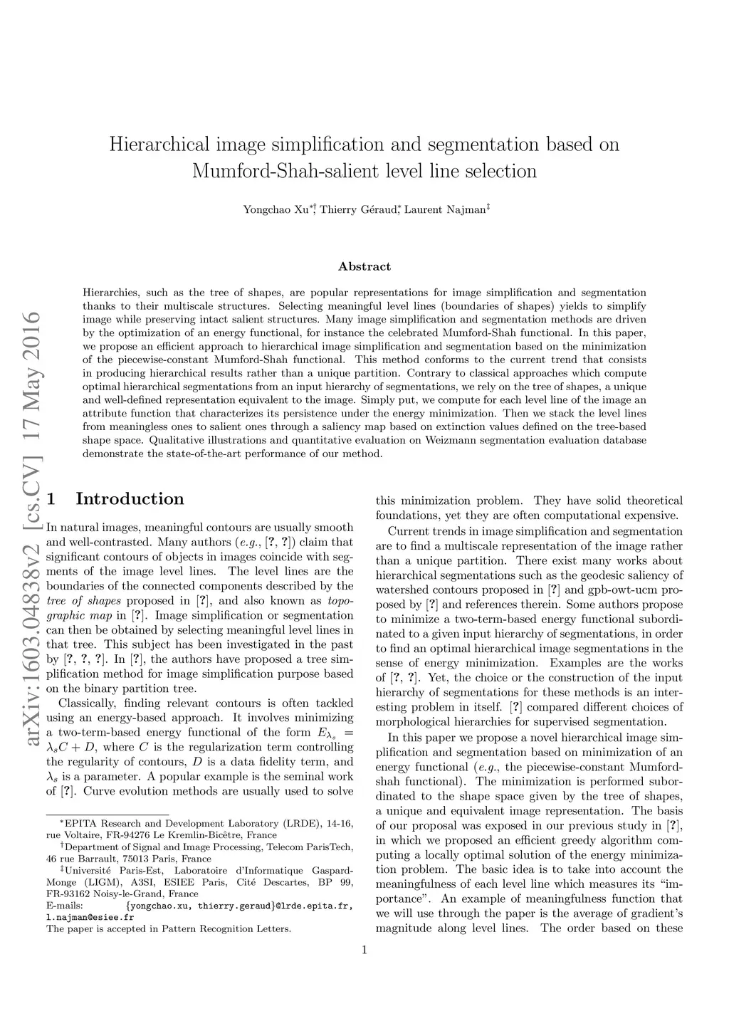 Hierarchies, such as the tree of shapes, are popular representations for image simplification and segmentation thanks to their multiscale structures. Selecting meaningful level lines (boundaries of shapes) yields to simplify image while preserving intact salient structures. Many image simplification and segmentation methods are driven by the optimization of an energy functional, for instance the celebrated Mumford-Shah functional. In this paper, we propose an efficient approach to hierarchical image simplification and segmentation based on the minimization of the piecewise-constant Mumford-Shah functional. This method conforms to the current trend that consists in producing hierarchical results rather than a unique partition. Contrary to classical approaches which compute optimal hierarchical segmentations from an input hierarchy of segmentations, we rely on the tree of shapes, a unique and well-defined representation equivalent to the image. Simply put, we compute for each level line of the image an attribute function that characterizes its persistence under the energy minimization. Then we stack the level lines from meaningless ones to salient ones through a saliency map based on extinction values defined on the tree-based shape space. Qualitative illustrations and quantitative evaluation on Weizmann segmentation evaluation database demonstrate the state-of-the-art performance of our method.