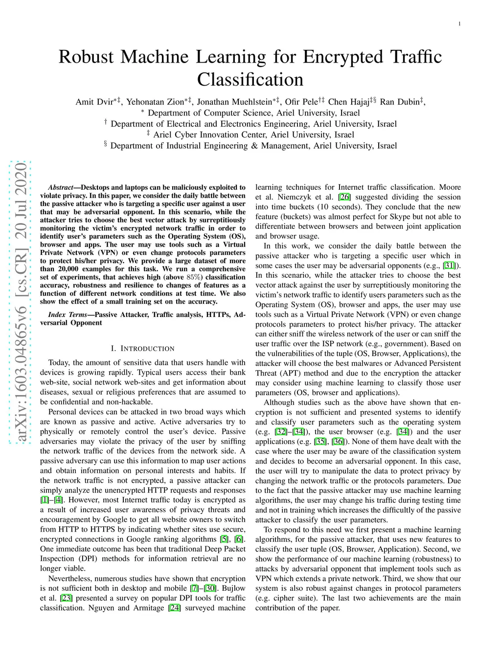 Desktops and laptops can be maliciously exploited to violate privacy. In this paper, we consider the daily battle between the passive attacker who is targeting a specific user against a user that may be adversarial opponent. In this scenario, while the attacker tries to choose the best vector attack by surreptitiously monitoring the victims encrypted network traffic in order to identify users parameters such as the Operating System (OS), browser and apps. The user may use tools such as a Virtual Private Network (VPN) or even change protocols parameters to protect his/her privacy. We provide a large dataset of more than 20,000 examples for this task. We run a comprehensive set of experiments, that achieves high (above 85) classification accuracy, robustness and resilience to changes of features as a function of different network conditions at test time. We also show the effect of a small training set on the accuracy.