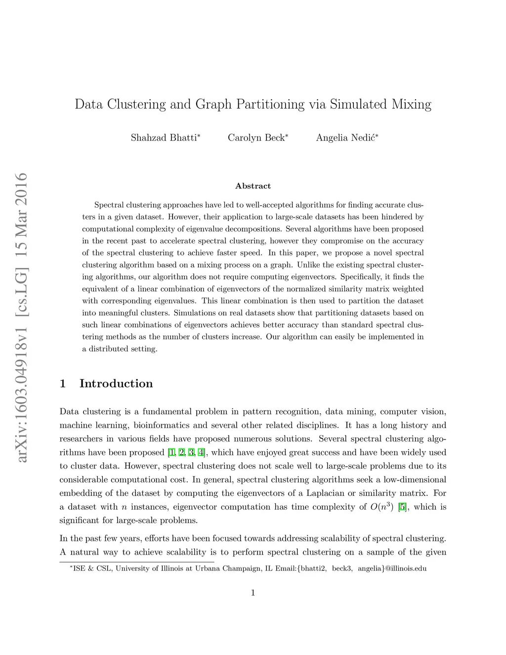 Spectral clustering approaches have led to well-accepted algorithms for finding accurate clusters in a given dataset. However, their application to large-scale datasets has been hindered by computational complexity of eigenvalue decompositions. Several algorithms have been proposed in the recent past to accelerate spectral clustering, however they compromise on the accuracy of the spectral clustering to achieve faster speed. In this paper, we propose a novel spectral clustering algorithm based on a mixing process on a graph. Unlike the existing spectral clustering algorithms, our algorithm does not require computing eigenvectors. Specifically, it finds the equivalent of a linear combination of eigenvectors of the normalized similarity matrix weighted with corresponding eigenvalues. This linear combination is then used to partition the dataset into meaningful clusters. Simulations on real datasets show that partitioning datasets based on such linear combinations of eigenvectors achieves better accuracy than standard spectral clustering methods as the number of clusters increase. Our algorithm can easily be implemented in a distributed setting.
