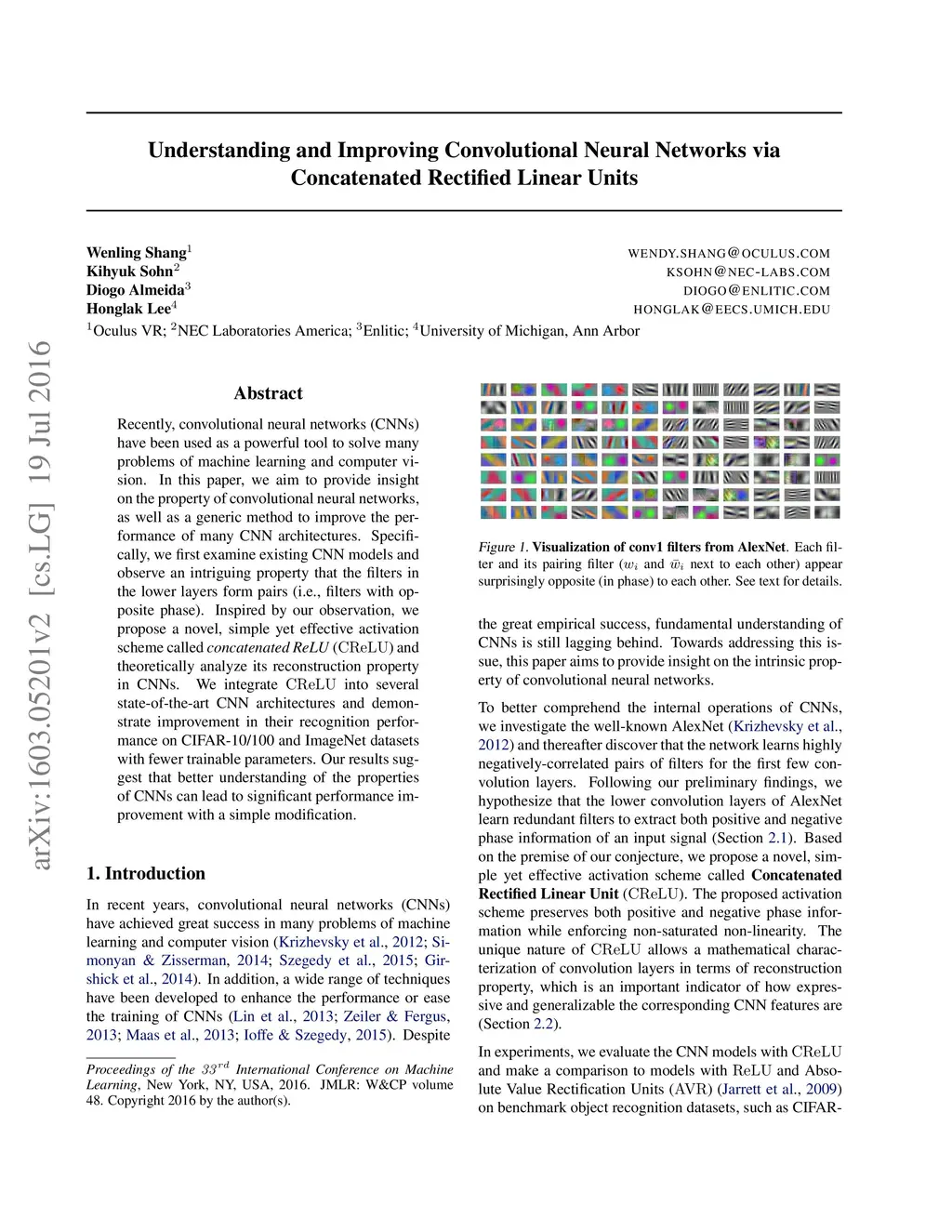 Recently, convolutional neural networks (CNNs) have been used as a powerful tool to solve many problems of machine learning and computer vision. In this paper, we aim to provide insight on the property of convolutional neural networks, as well as a generic method to improve the performance of many CNN architectures. Specifically, we first examine existing CNN models and observe an intriguing property that the filters in the lower layers form pairs (i.e., filters with opposite phase). Inspired by our observation, we propose a novel, simple yet effective activation scheme called concatenated ReLU (CRelu) and theoretically analyze its reconstruction property in CNNs. We integrate CRelu into several state-of-the-art CNN architectures and demonstrate improvement in their recognition performance on CIFAR-10/100 and ImageNet datasets with fewer trainable parameters. Our results suggest that better understanding of the properties of CNNs can lead to significant performance improvement with a simple modification.