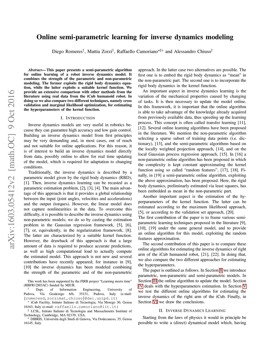 Online semi-parametric learning for inverse dynamics modeling