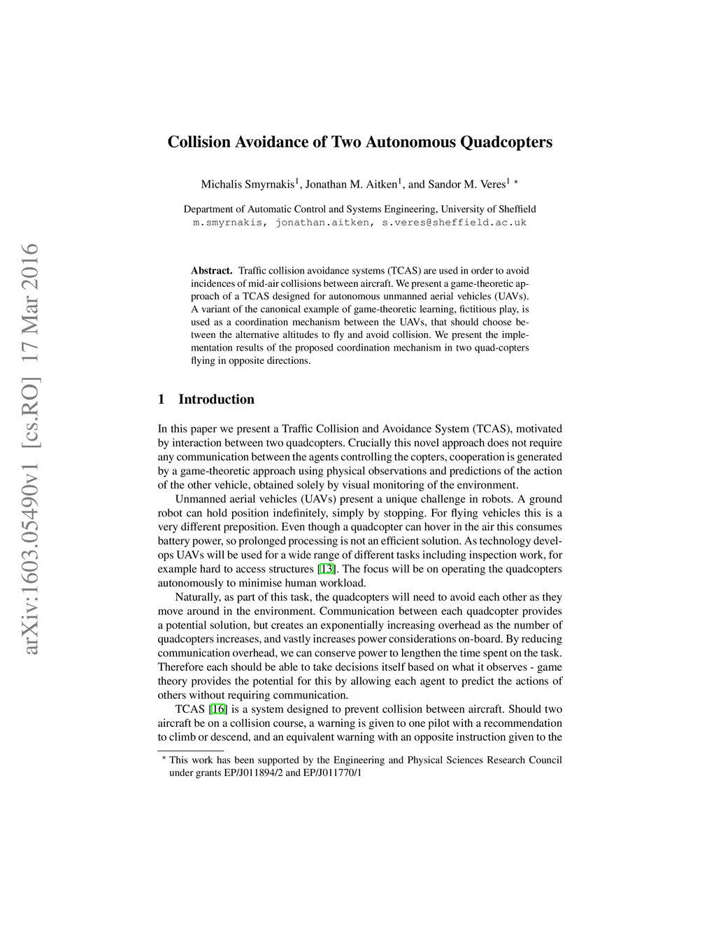 Traffic collision avoidance systems (TCAS) are used in order to avoid incidences of mid-air collisions between aircraft. We present a game-theoretic approach of a TCAS designed for autonomous unmanned aerial vehicles (UAVs). A variant of the canonical example of game-theoretic learning, fictitious play, is used as a coordination mechanism between the UAVs, that should choose between the alternative altitudes to fly and avoid collision. We present the implementation results of the proposed coordination mechanism in two quad-copters flying in opposite directions.