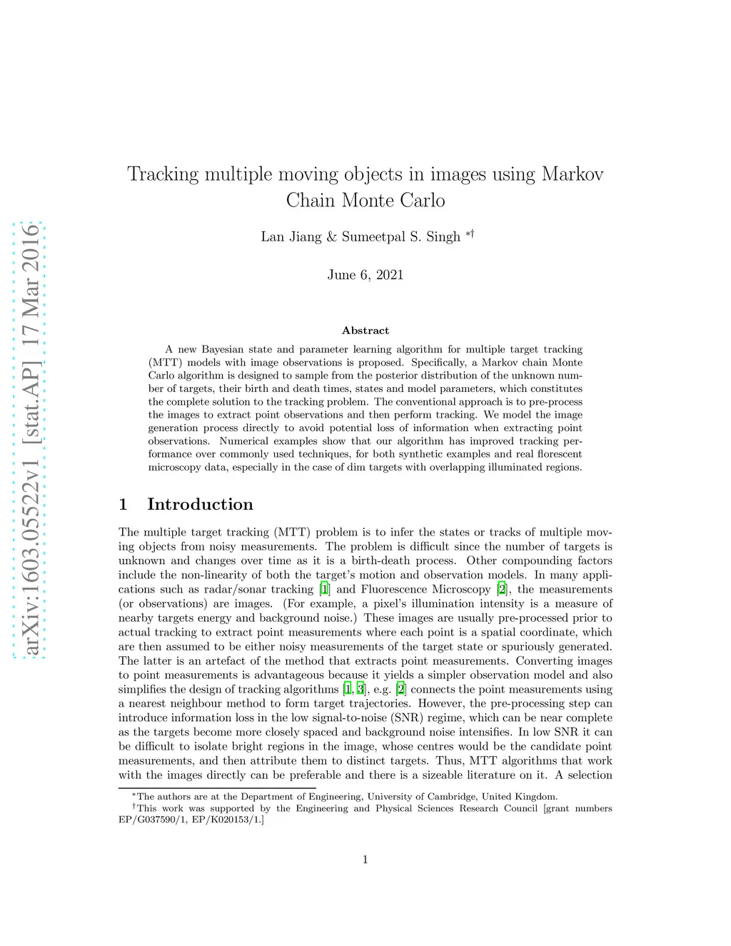 Tracking multiple moving objects in images using Markov Chain Monte