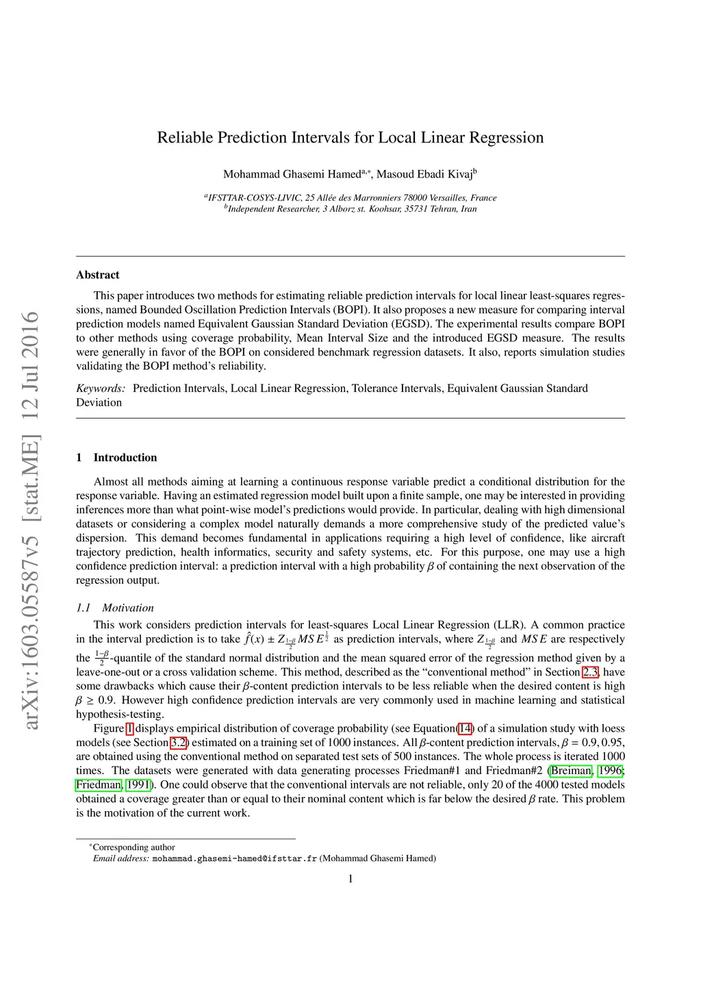 This paper introduces two methods for estimating reliable prediction intervals for local linear least-squares regressions, named Bounded Oscillation Prediction Intervals (BOPI). It also proposes a new measure for comparing interval prediction models named Equivalent Gaussian Standard Deviation (EGSD). The experimental results compare BOPI to other methods using coverage probability, Mean Interval Size and the introduced EGSD measure. The results were generally in favor of the BOPI on considered benchmark regression datasets. It also, reports simulation studies validating the BOPI method's reliability.