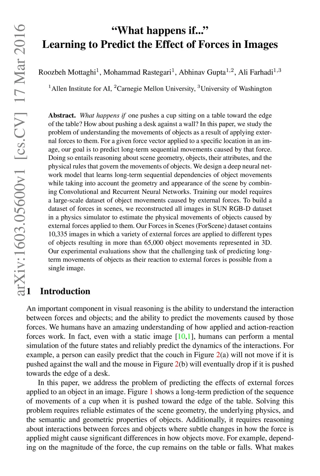 What happens if one pushes a cup sitting on a table toward the edge of the table? How about pushing a desk against a wall? In this paper, we study the problem of understanding the movements of objects as a result of applying external forces to them. For a given force vector applied to a specific location in an image, our goal is to predict long-term sequential movements caused by that force. Doing so entails reasoning about scene geometry, objects, their attributes, and the physical rules that govern the movements of objects. We design a deep neural network model that learns long-term sequential dependencies of object movements while taking into account the geometry and appearance of the scene by combining Convolutional and Recurrent Neural Networks. Training our model requires a large-scale dataset of object movements caused by external forces. To build a dataset of forces in scenes, we reconstructed all images in SUN RGB-D dataset in a physics simulator to estimate the physical movements of objects caused by external forces applied to them. Our Forces in Scenes (ForScene) dataset contains 10,335 images in which a variety of external forces are applied to different types of objects resulting in more than 65,000 object movements represented in 3D. Our experimental evaluations show that the challenging task of predicting long-term movements of objects as their reaction to external forces is possible from a single image.