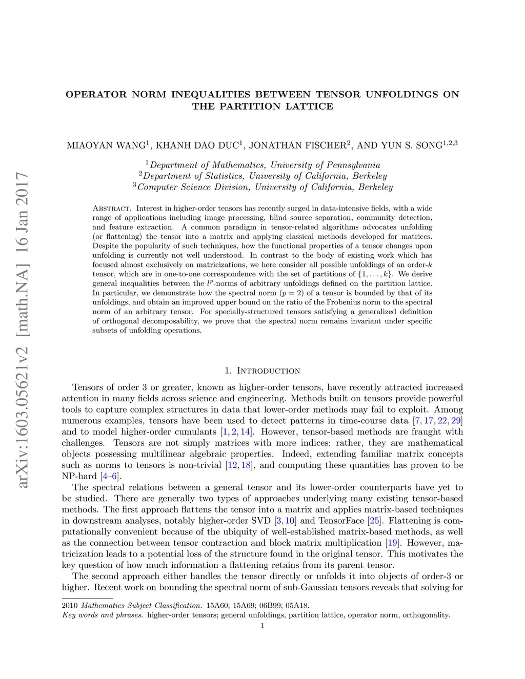 Interest in higher-order tensors has recently surged in data-intensive fields, with a wide range of applications including image processing, blind source separation, community detection, and feature extraction. A common paradigm in tensor-related algorithms advocates unfolding (or flattening) the tensor into a matrix and applying classical methods developed for matrices. Despite the popularity of such techniques, how the functional properties of a tensor changes upon unfolding is currently not well understood. In contrast to the body of existing work which has focused almost exclusively on matricizations, we here consider all possible unfoldings of an order- tensor, which are in one-to-one correspondence with the set of partitions of . We derive general inequalities between the -norms of arbitrary unfoldings defined on the partition lattice. In particular, we demonstrate how the spectral norm () of a tensor is bounded by that of its unfoldings, and obtain an improved upper bound on the ratio of the Frobenius norm to the spectral norm of an arbitrary tensor. For specially-structured tensors satisfying a generalized definition of orthogonal decomposability, we prove that the spectral norm remains invariant under specific subsets of unfolding operations.