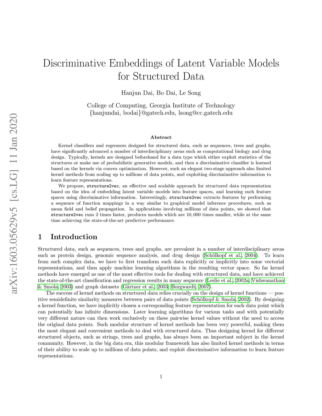 Kernel classifiers and regressors designed for structured data, such as sequences, trees and graphs, have significantly advanced a number of interdisciplinary areas such as computational biology and drug design. Typically, kernels are designed beforehand for a data type which either exploit statistics of the structures or make use of probabilistic generative models, and then a discriminative classifier is learned based on the kernels via convex optimization. However, such an elegant two-stage approach also limited kernel methods from scaling up to millions of data points, and exploiting discriminative information to learn feature representations. We propose, structure2vec, an effective and scalable approach for structured data representation based on the idea of embedding latent variable models into feature spaces, and learning such feature spaces using discriminative information. Interestingly, structure2vec extracts features by performing a sequence of function mappings in a way similar to graphical model inference procedures, such as mean field and belief propagation. In applications involving millions of data points, we showed that structure2vec runs 2 times faster, produces models which are times smaller, while at the same time achieving the state-of-the-art predictive performance.