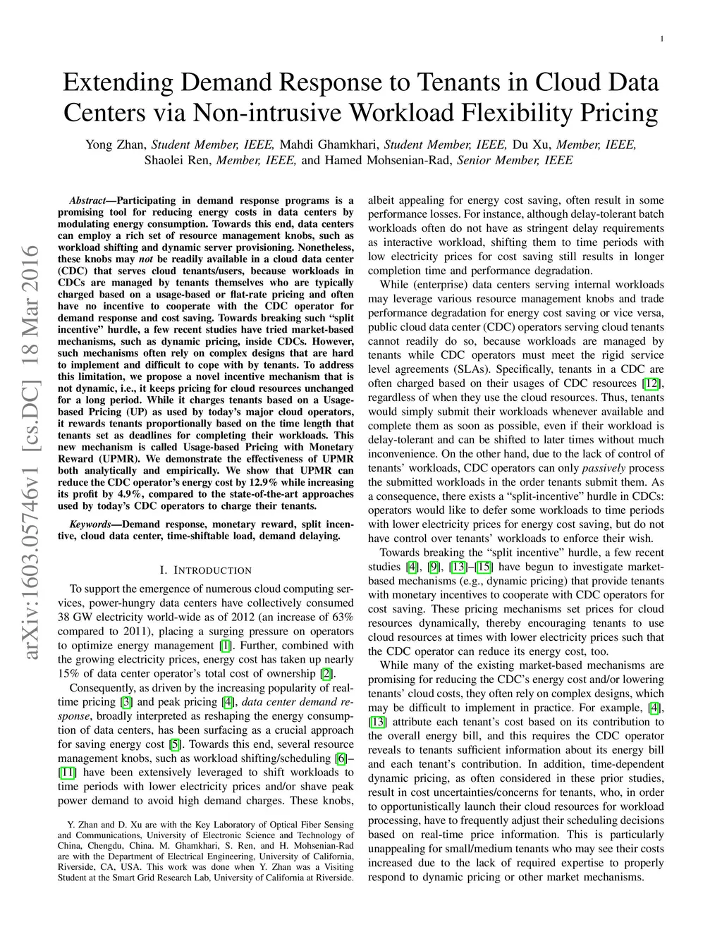 Participating in demand response programs is a promising tool for reducing energy costs in data centers by modulating energy consumption. Towards this end, data centers can employ a rich set of resource management knobs, such as workload shifting and dynamic server provisioning. Nonetheless, these knobs may not be readily available in a cloud data center (CDC) that serves cloud tenants/users, because workloads in CDCs are managed by tenants themselves who are typically charged based on a usage-based or flat-rate pricing and often have no incentive to cooperate with the CDC operator for demand response and cost saving. Towards breaking such "split incentive" hurdle, a few recent studies have tried market-based mechanisms, such as dynamic pricing, inside CDCs. However, such mechanisms often rely on complex designs that are hard to implement and difficult to cope with by tenants. To address this limitation, we propose a novel incentive mechanism that is not dynamic, i.e., it keeps pricing for cloud resources unchanged for a long period. While it charges tenants based on a Usage-based Pricing (UP) as used by today's major cloud operators, it rewards tenants proportionally based on the time length that tenants set as deadlines for completing their workloads. This new mechanism is called Usage-based Pricing with Monetary Reward (UPMR). We demonstrate the effectiveness of UPMR both analytically and empirically. We show that UPMR can reduce the CDC operator's energy cost by 12.9% while increasing its profit by 4.9%, compared to the state-of-the-art approaches used by today's CDC operators to charge their tenants.