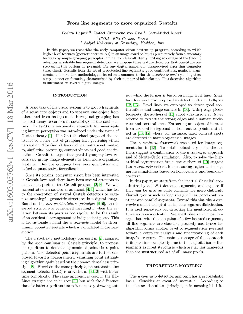 In this paper, we reconsider the early computer vision bottom-up program, according to which higher level features (geometric structures) in an image could be built up recursively from elementary features by simple grouping principles coming from Gestalt theory. Taking advantage of the (recent) advances in reliable line segment detectors, we propose three feature detectors that constitute one step up in this bottom up pyramid. For any digital image, our unsupervised algorithm computes three classic Gestalts from the set of predetected line segments: good continuations, nonlocal alignments, and bars. The methodology is based on a common stochastic {\it a contrario model} yielding three simple detection formulas, characterized by their number of false alarms. This detection algorithm is illustrated on several digital images.
