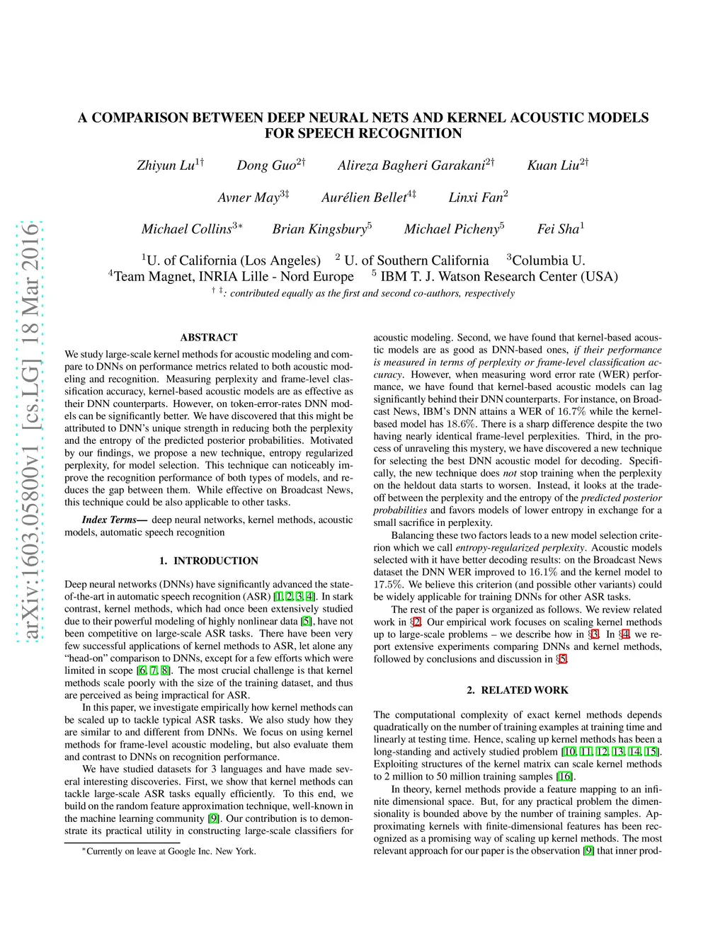 We study large-scale kernel methods for acoustic modeling and compare to DNNs on performance metrics related to both acoustic modeling and recognition. Measuring perplexity and frame-level classification accuracy, kernel-based acoustic models are as effective as their DNN counterparts. However, on token-error-rates DNN models can be significantly better. We have discovered that this might be attributed to DNN's unique strength in reducing both the perplexity and the entropy of the predicted posterior probabilities. Motivated by our findings, we propose a new technique, entropy regularized perplexity, for model selection. This technique can noticeably improve the recognition performance of both types of models, and reduces the gap between them. While effective on Broadcast News, this technique could be also applicable to other tasks.