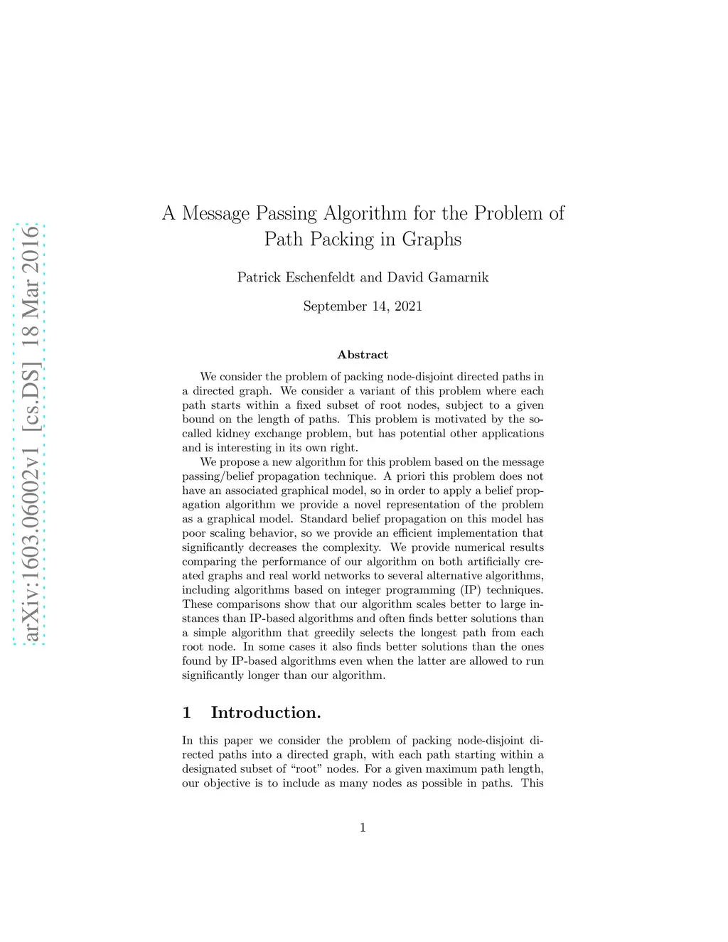 We consider the problem of packing node-disjoint directed paths in a directed graph. We consider a variant of this problem where each path starts within a fixed subset of root nodes, subject to a given bound on the length of paths. This problem is motivated by the so-called kidney exchange problem, but has potential other applications and is interesting in its own right. We propose a new algorithm for this problem based on the message passing/belief propagation technique. A priori this problem does not have an associated graphical model, so in order to apply a belief propagation algorithm we provide a novel representation of the problem as a graphical model. Standard belief propagation on this model has poor scaling behavior, so we provide an efficient implementation that significantly decreases the complexity. We provide numerical results comparing the performance of our algorithm on both artificially created graphs and real world networks to several alternative algorithms, including algorithms based on integer programming (IP) techniques. These comparisons show that our algorithm scales better to large instances than IP-based algorithms and often finds better solutions than a simple algorithm that greedily selects the longest path from each root node. In some cases it also finds better solutions than the ones found by IP-based algorithms even when the latter are allowed to run significantly longer than our algorithm.