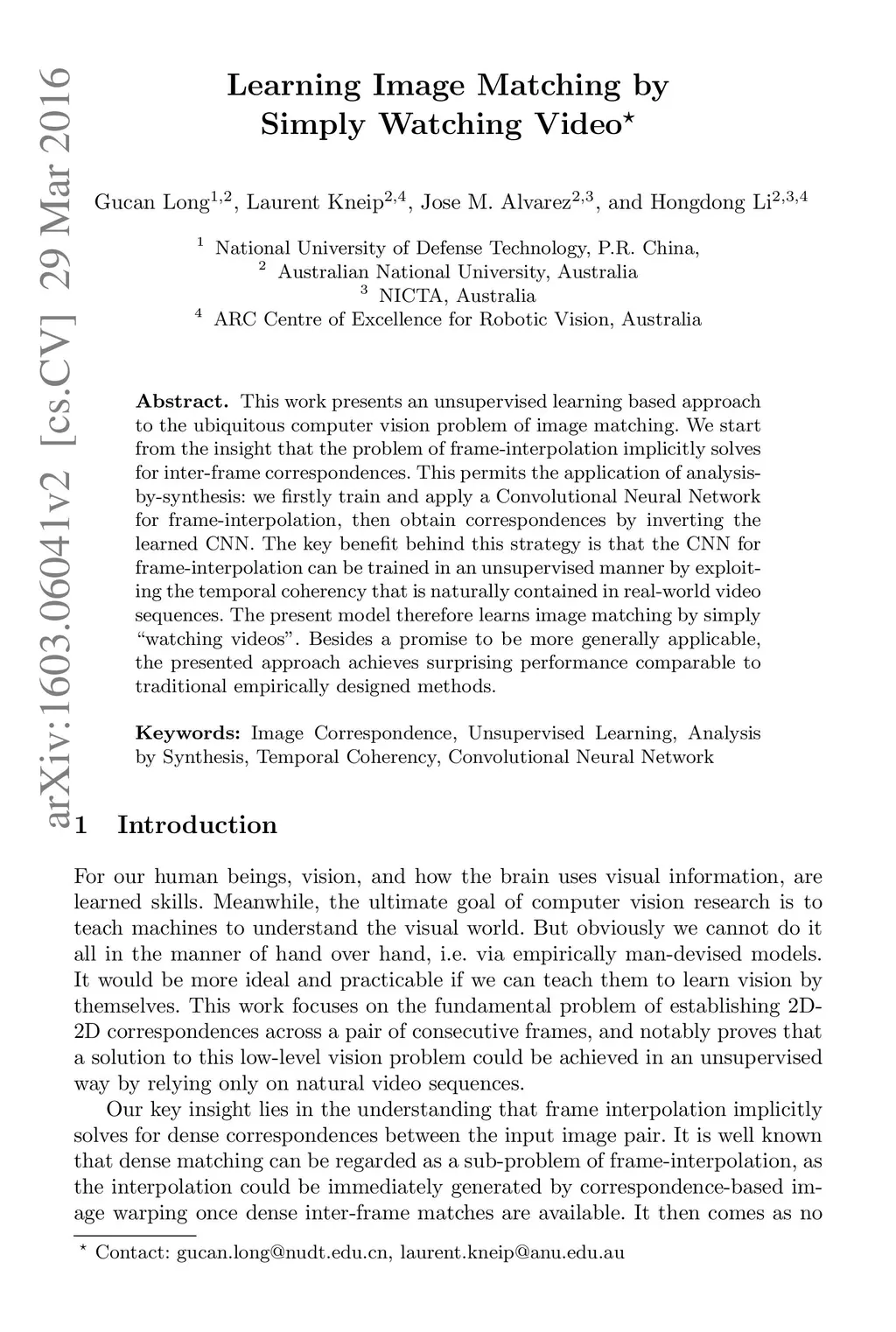 This work presents an unsupervised learning based approach to the ubiquitous computer vision problem of image matching. We start from the insight that the problem of frame-interpolation implicitly solves for inter-frame correspondences. This permits the application of analysis-by-synthesis: we firstly train and apply a Convolutional Neural Network for frame-interpolation, then obtain correspondences by inverting the learned CNN. The key benefit behind this strategy is that the CNN for frame-interpolation can be trained in an unsupervised manner by exploiting the temporal coherency that is naturally contained in real-world video sequences. The present model therefore learns image matching by simply watching videos. Besides a promise to be more generally applicable, the presented approach achieves surprising performance comparable to traditional empirically designed methods.
