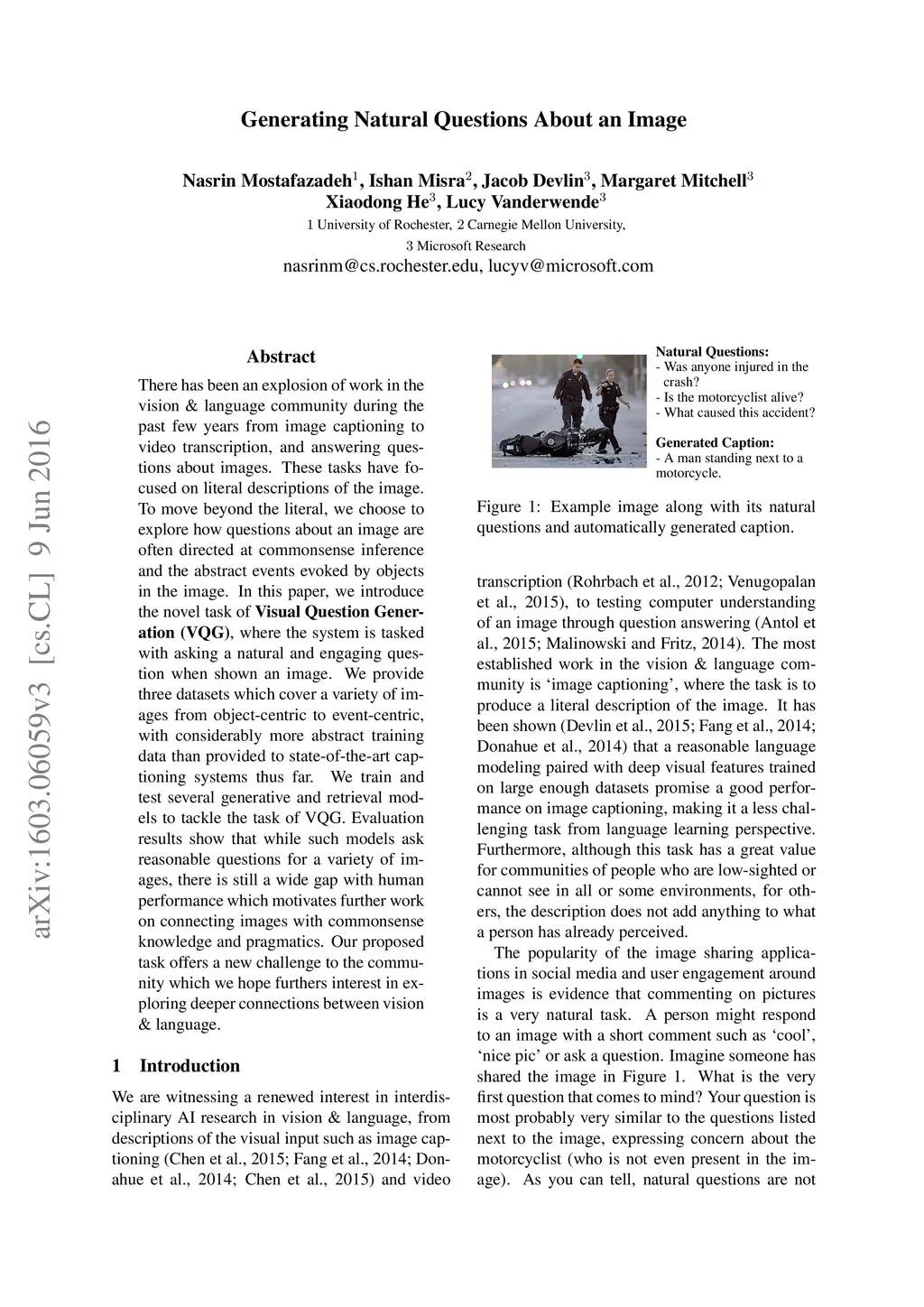 There has been an explosion of work in the vision & language community during the past few years from image captioning to video transcription, and answering questions about images. These tasks have focused on literal descriptions of the image. To move beyond the literal, we choose to explore how questions about an image are often directed at commonsense inference and the abstract events evoked by objects in the image. In this paper, we introduce the novel task of Visual Question Generation (VQG), where the system is tasked with asking a natural and engaging question when shown an image. We provide three datasets which cover a variety of images from object-centric to event-centric, with considerably more abstract training data than provided to state-of-the-art captioning systems thus far. We train and test several generative and retrieval models to tackle the task of VQG. Evaluation results show that while such models ask reasonable questions for a variety of images, there is still a wide gap with human performance which motivates further work on connecting images with commonsense knowledge and pragmatics. Our proposed task offers a new challenge to the community which we hope furthers interest in exploring deeper connections between vision & language.