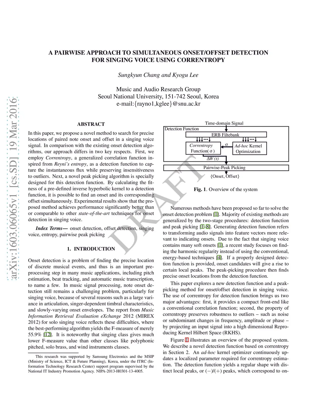 In this paper, we propose a novelmethod to search for precise locations of paired note onset and offset in a singing voice signal. In comparison with the existing onset detection algorithms,our approach differs in two key respects. First, we employ Correntropy, a generalized correlation function inspired from Reyni's entropy, as a detection function to capture the instantaneous flux while preserving insensitiveness to outliers. Next, a novel peak picking algorithm is specially designed for this detection function. By calculating the fitness of a pre-defined inverse hyperbolic kernel to a detection function, it is possible to find an onset and its corresponding offset simultaneously. Experimental results show that the proposed method achieves performance significantly better than or comparable to other state-of-the-art techniques for onset detection in singing voice.
