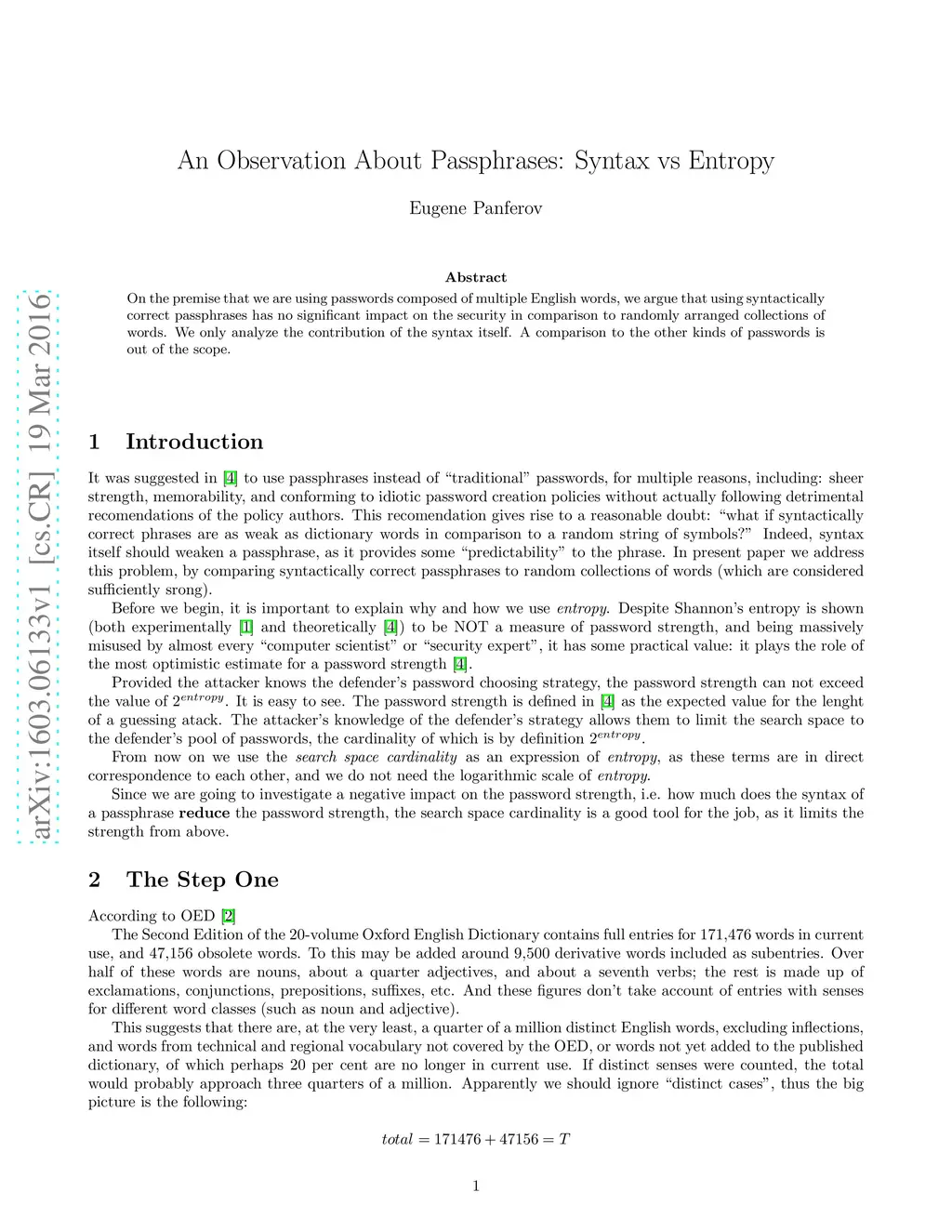 On the premise that we are using passwords composed of multiple English words, we argue that using syntactically correct passphrases has no significant impact on the security in comparison to randomly arranged collections of words. We only analyze the contribution of the syntax itself. A comparison to the other kinds of passwords is out of the scope.