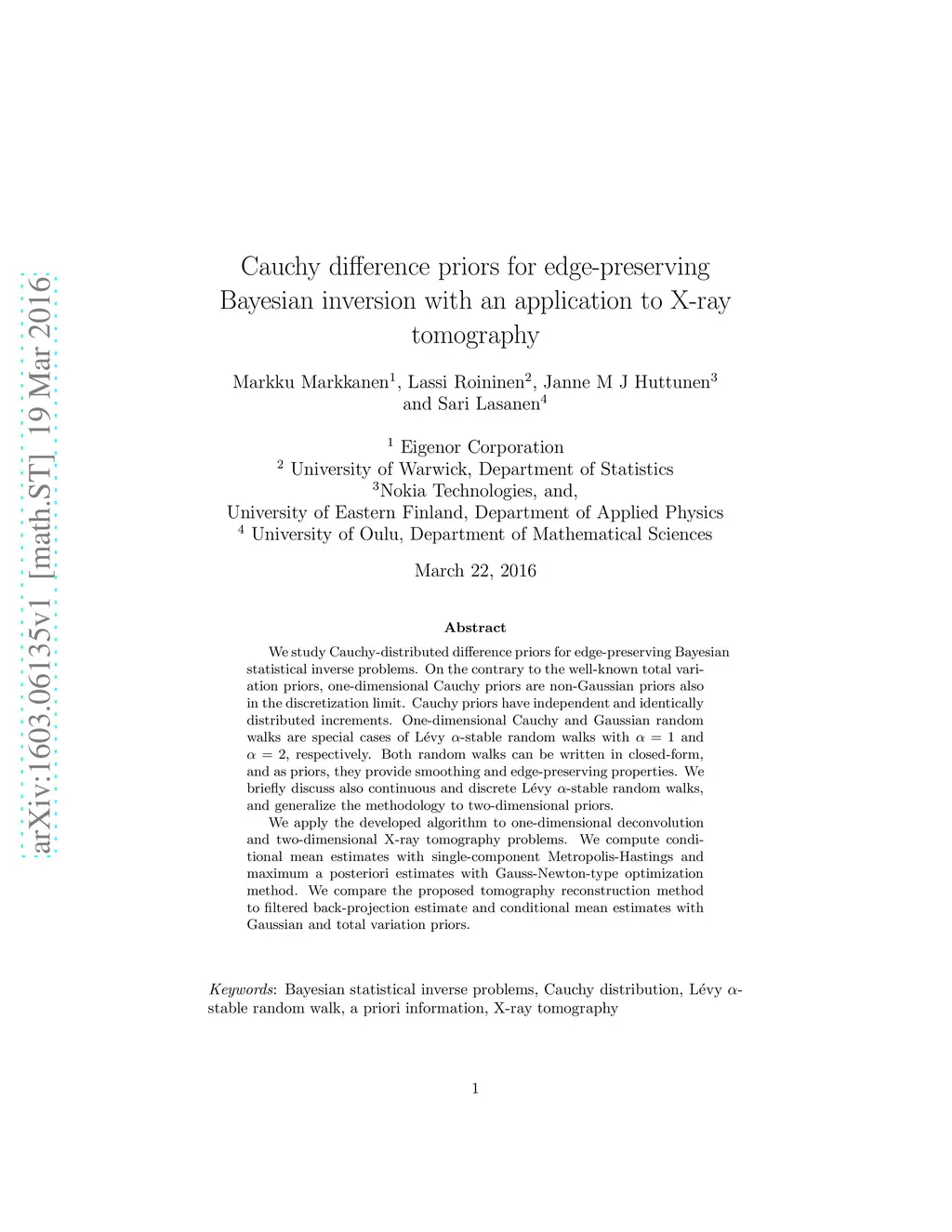 We study Cauchy-distributed difference priors for edge-preserving Bayesian statistical inverse problems. On the contrary to the well-known total variation priors, one-dimensional Cauchy priors are non-Gaussian priors also in the discretization limit. Cauchy priors have independent and identically distributed increments. One-dimensional Cauchy and Gaussian random walks are special cases of L\évy -stable random walks with and , respectively. Both random walks can be written in closed-form, and as priors, they provide smoothing and edge-preserving properties. We briefly discuss also continuous and discrete L\évy -stable random walks, and generalize the methodology to two-dimensional priors. We apply the developed algorithm to one-dimensional deconvolution and two-dimensional X-ray tomography problems. We compute conditional mean estimates with single-component Metropolis-Hastings and maximum a posteriori estimates with Gauss-Newton-type optimization method. We compare the proposed tomography reconstruction method to filtered back-projection estimate and conditional mean estimates with Gaussian and total variation priors.
