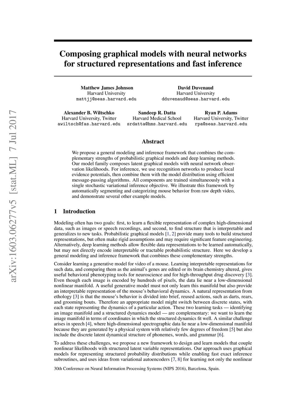 We propose a general modeling and inference framework that composes probabilistic graphical models with deep learning methods and combines their respective strengths. Our model family augments graphical structure in latent variables with neural network observation models. For inference, we extend variational autoencoders to use graphical model approximating distributions with recognition networks that output conjugate potentials. All components of these models are learned simultaneously with a single objective, giving a scalable algorithm that leverages stochastic variational inference, natural gradients, graphical model message passing, and the reparameterization trick. We illustrate this framework with several example models and an application to mouse behavioral phenotyping.