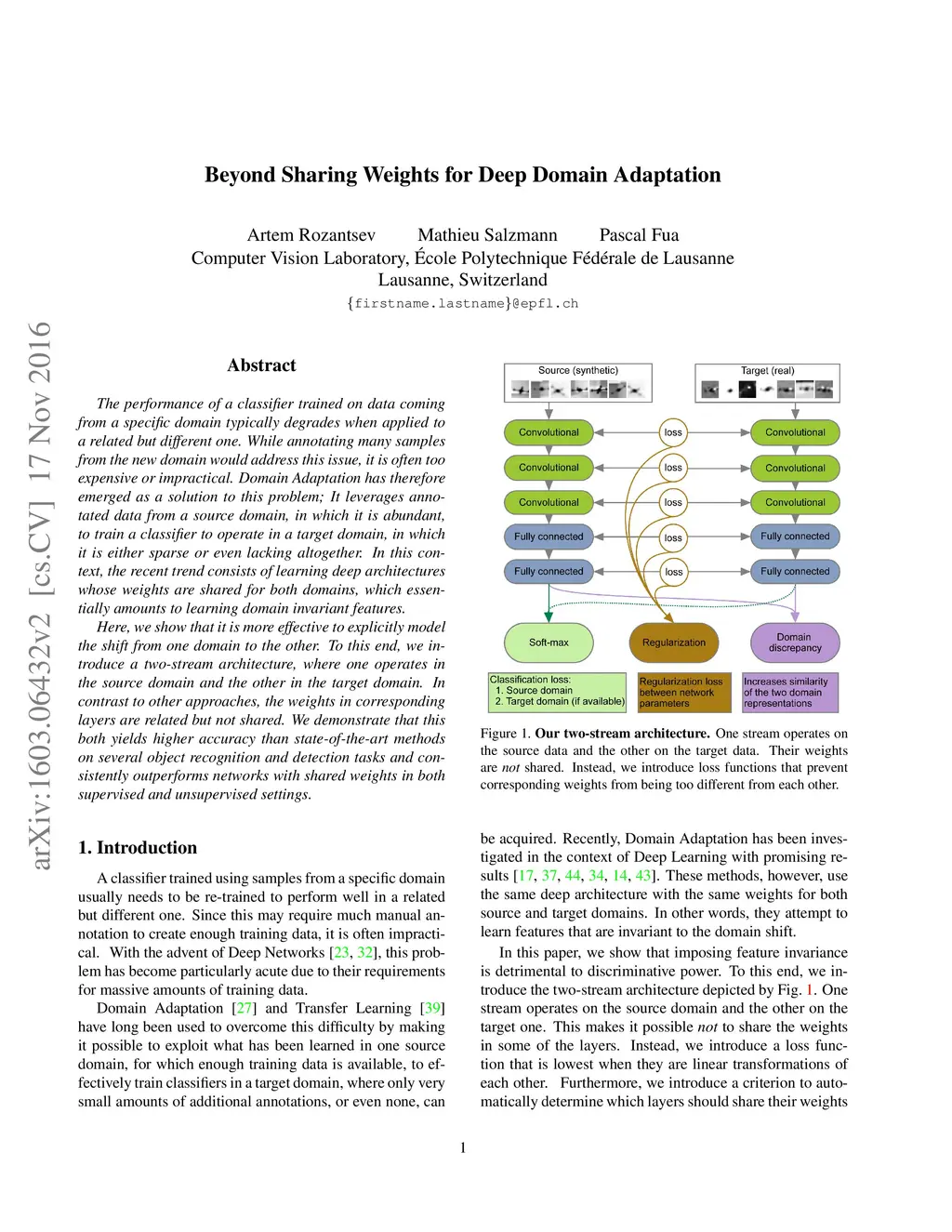The performance of a classifier trained on data coming from a specific domain typically degrades when applied to a related but different one. While annotating many samples from the new domain would address this issue, it is often too expensive or impractical. Domain Adaptation has therefore emerged as a solution to this problem; It leverages annotated data from a source domain, in which it is abundant, to train a classifier to operate in a target domain, in which it is either sparse or even lacking altogether. In this context, the recent trend consists of learning deep architectures whose weights are shared for both domains, which essentially amounts to learning domain invariant features. Here, we show that it is more effective to explicitly model the shift from one domain to the other. To this end, we introduce a two-stream architecture, where one operates in the source domain and the other in the target domain. In contrast to other approaches, the weights in corresponding layers are related but not shared. We demonstrate that this both yields higher accuracy than state-of-the-art methods on several object recognition and detection tasks and consistently outperforms networks with shared weights in both supervised and unsupervised settings.
