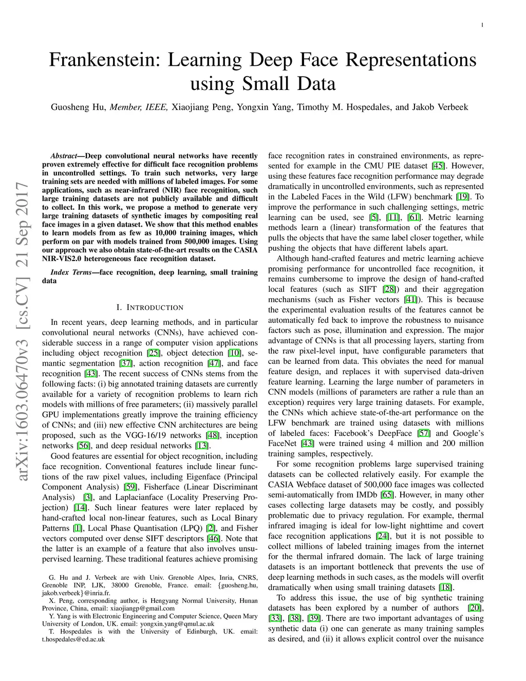 Deep convolutional neural networks have recently proven extremely effective for difficult face recognition problems in uncontrolled settings. To train such networks, very large training sets are needed with millions of labeled images. For some applications, such as near-infrared (NIR) face recognition, such large training datasets are not publicly available and difficult to collect. In this work, we propose a method to generate very large training datasets of synthetic images by compositing real face images in a given dataset. We show that this method enables to learn models from as few as 10,000 training images, which perform on par with models trained from 500,000 images. Using our approach we also obtain state-of-the-art results on the CASIA NIR-VIS2.0 heterogeneous face recognition dataset.