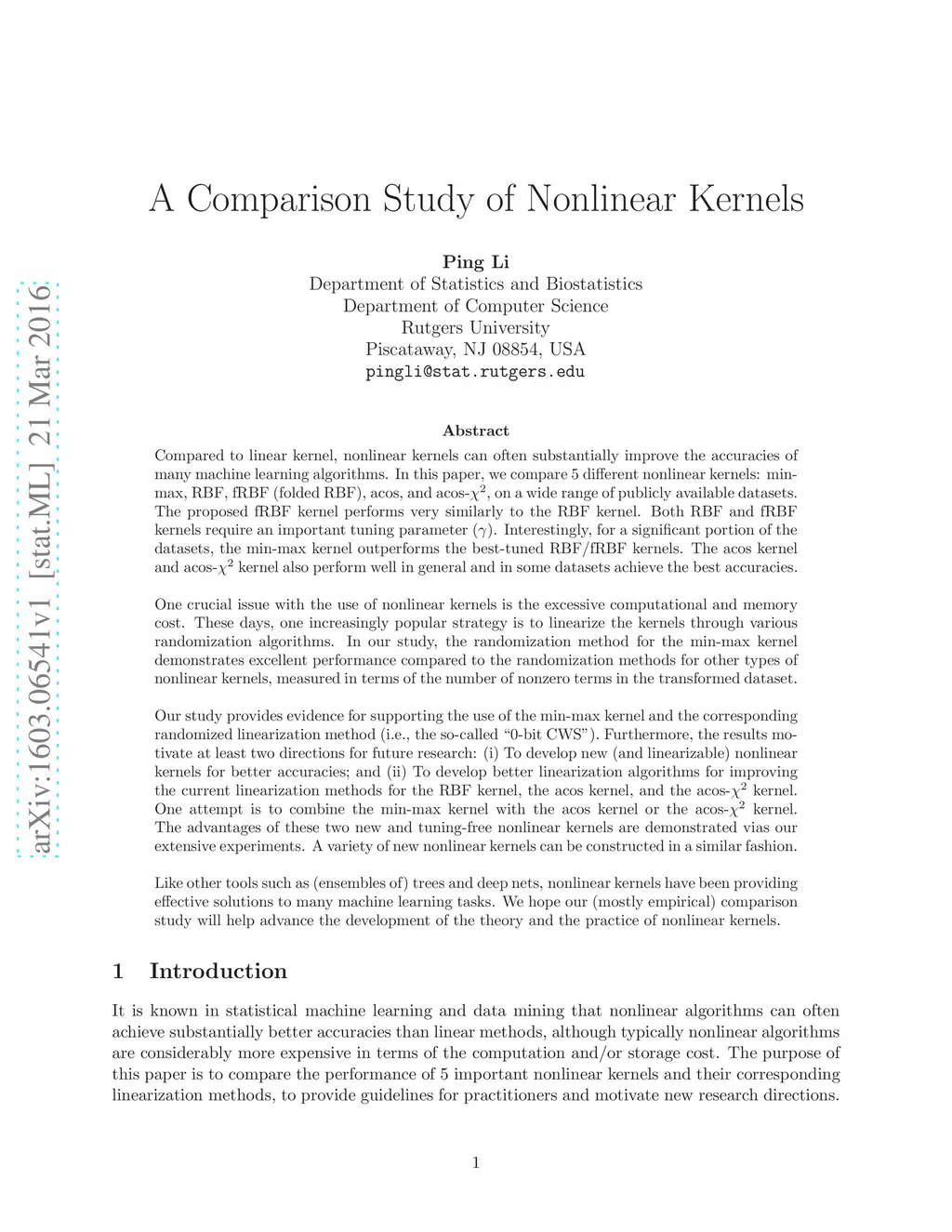 In this paper, we compare 5 different nonlinear kernels: min-max, RBF, fRBF (folded RBF), acos, and acos-, on a wide range of publicly available datasets. The proposed fRBF kernel performs very similarly to the RBF kernel. Both RBF and fRBF kernels require an important tuning parameter (). Interestingly, for a significant portion of the datasets, the min-max kernel outperforms the best-tuned RBF/fRBF kernels. The acos kernel and acos- kernel also perform well in general and in some datasets achieve the best accuracies. One crucial issue with the use of nonlinear kernels is the excessive computational and memory cost. These days, one increasingly popular strategy is to linearize the kernels through various randomization algorithms. In our study, the randomization method for the min-max kernel demonstrates excellent performance compared to the randomization methods for other types of nonlinear kernels, measured in terms of the number of nonzero terms in the transformed dataset. Our study provides evidence for supporting the use of the min-max kernel and the corresponding randomized linearization method (i.e., the so-called "0-bit CWS"). Furthermore, the results motivate at least two directions for future research: (i) To develop new (and linearizable) nonlinear kernels for better accuracies; and (ii) To develop better linearization algorithms for improving the current linearization methods for the RBF kernel, the acos kernel, and the acos- kernel. One attempt is to combine the min-max kernel with the acos kernel or the acos- kernel. The advantages of these two new and tuning-free nonlinear kernels are demonstrated vias our extensive experiments.