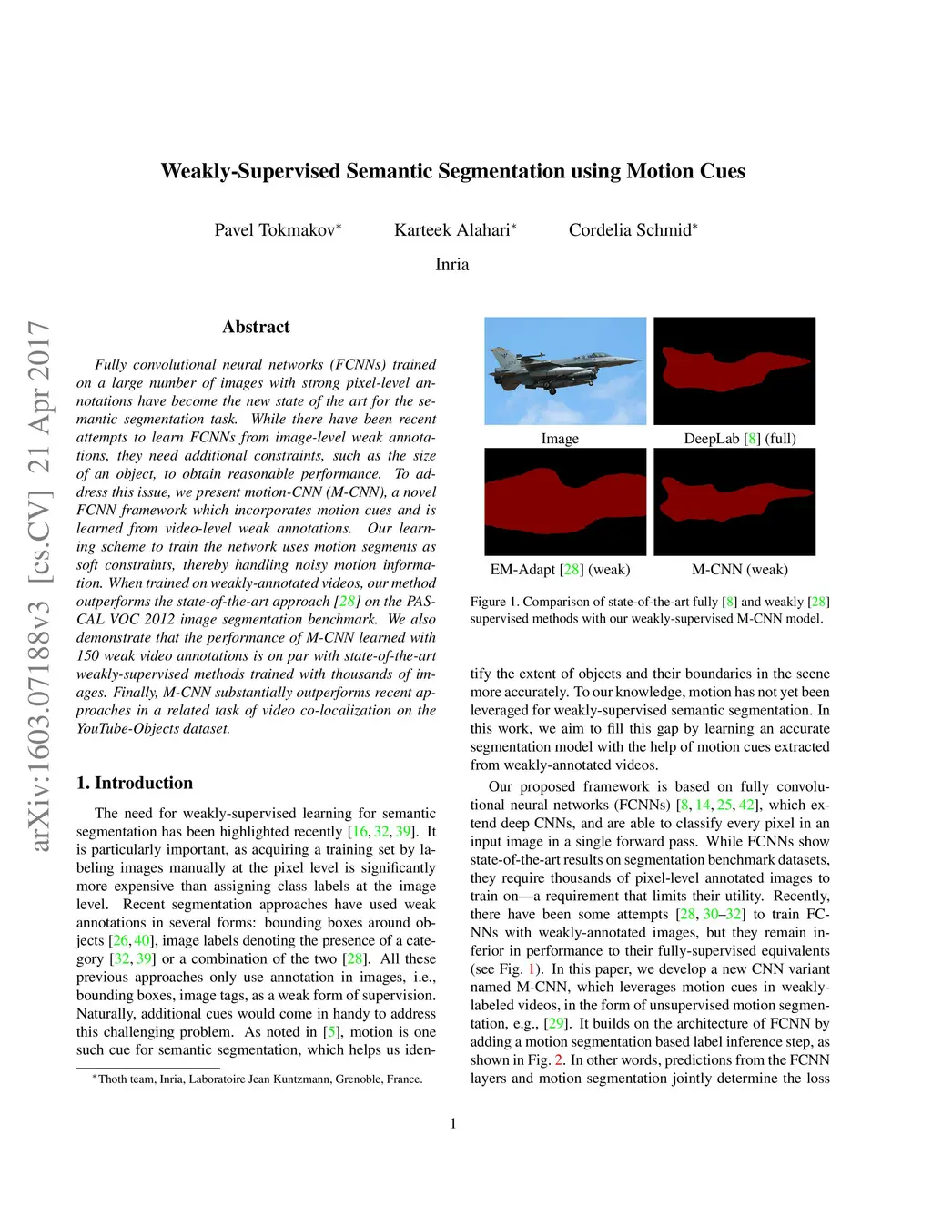 Fully convolutional neural networks (FCNNs) trained on a large number of images with strong pixel-level annotations have become the new state of the art for the semantic segmentation task. While there have been recent attempts to learn FCNNs from image-level weak annotations, they need additional constraints, such as the size of an object, to obtain reasonable performance. To address this issue, we present motion-CNN (M-CNN), a novel FCNN framework which incorporates motion cues and is learned from video-level weak annotations. Our learning scheme to train the network uses motion segments as soft constraints, thereby handling noisy motion information. When trained on weakly-annotated videos, our method outperforms the state-of-the-art EM-Adapt approach on the PASCAL VOC 2012 image segmentation benchmark. We also demonstrate that the performance of M-CNN learned with 150 weak video annotations is on par with state-of-the-art weakly-supervised methods trained with thousands of images. Finally, M-CNN substantially outperforms recent approaches in a related task of video co-localization on the YouTube-Objects dataset.